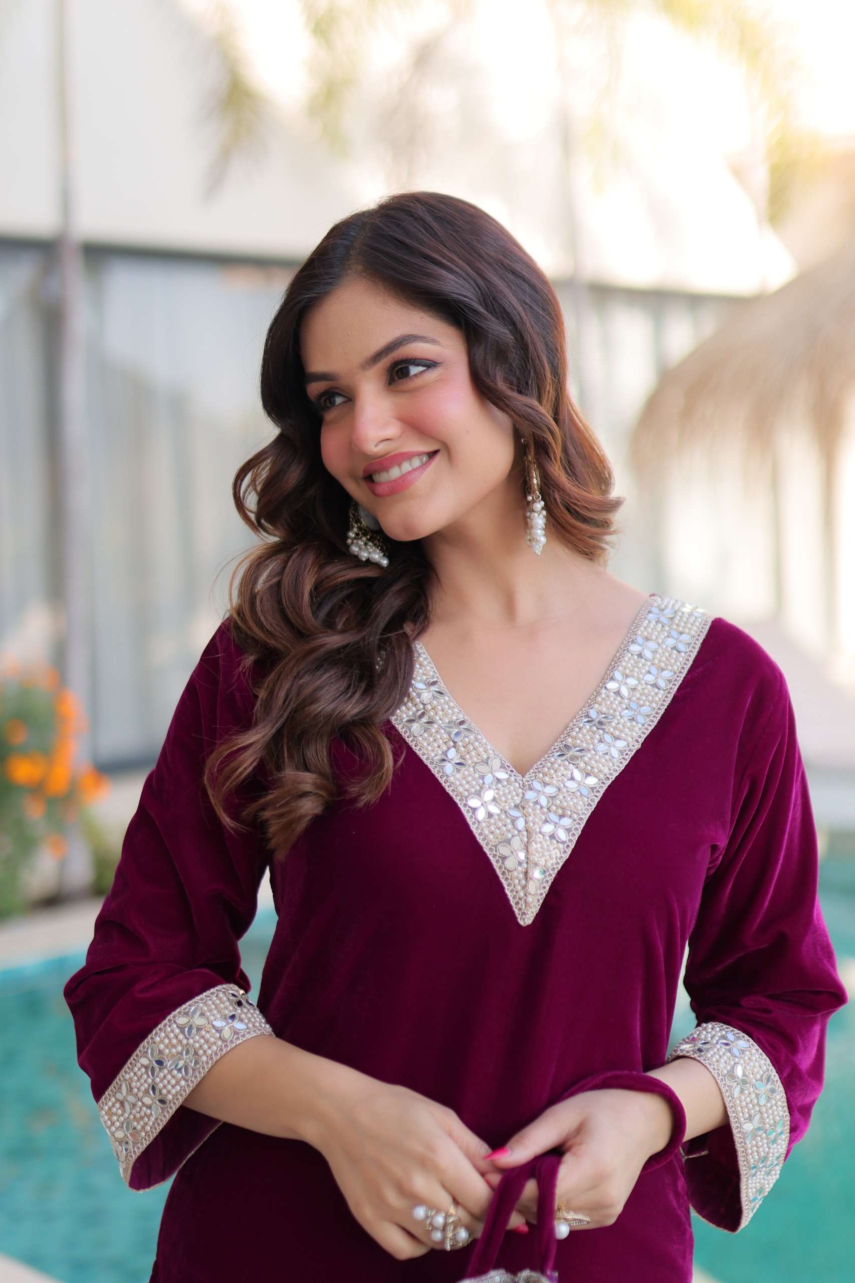 *TOP* :-👇🏻 👉🏻 *FABRICS & WORK* :- 9000 Velvet with Rich Zari Embroidered & Real Mirror & Moti Lace work 👉🏻 *SIZE* :- M(38"), L(40"), XL(42"), XXL(44") 👉🏻 *LENGTH* :- 42 INCH 👉🏻 *LINING* :- Cotton (Full Inner Top To Bottom) 👉🏻 *SLEEVES* :- Full Sleeves (Bell Sleeve) 👉🏻 *NECK TYPE* :- V Neck (MIRROR WORK PATTERN) 👉🏻 *STITCHING TYPE* :- Standard Stitching