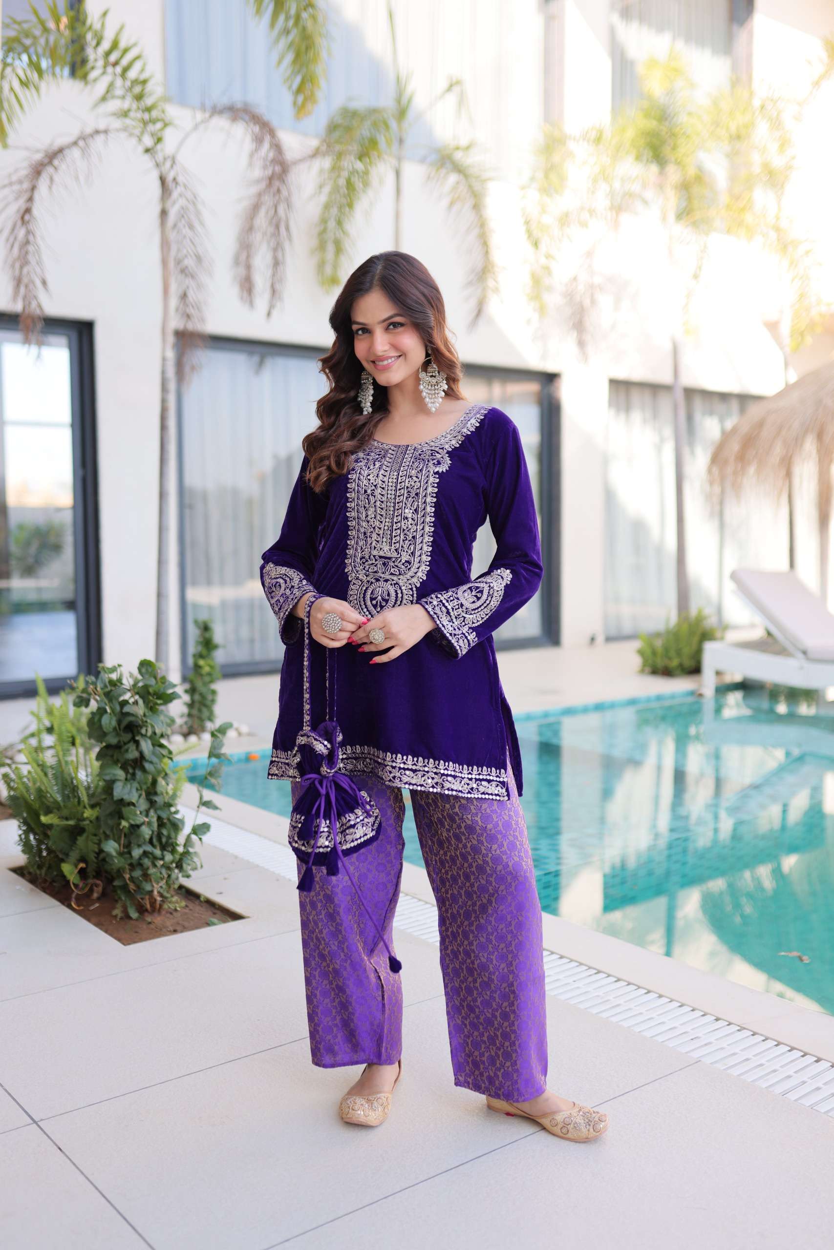 *TOP* :-👇🏻 👉🏻 *FABRICS & WORK* :- 9000 Velvet with Rich Zari Coding Embroidered work 👉🏻 *SIZE* :- M(38"), L(40"), XL(42"), XXL(44") 👉🏻 *LENGTH* :- 32 INCH 👉🏻 *LINING* :- Cotton (Full Inner Top To Bottom) 👉🏻 *SLEEVES* :- Full Sleeves (Bell Sleeve) 👉🏻 *NECK TYPE* :- Round Neck 👉🏻 *STITCHING TYPE* :- Standard Stitching