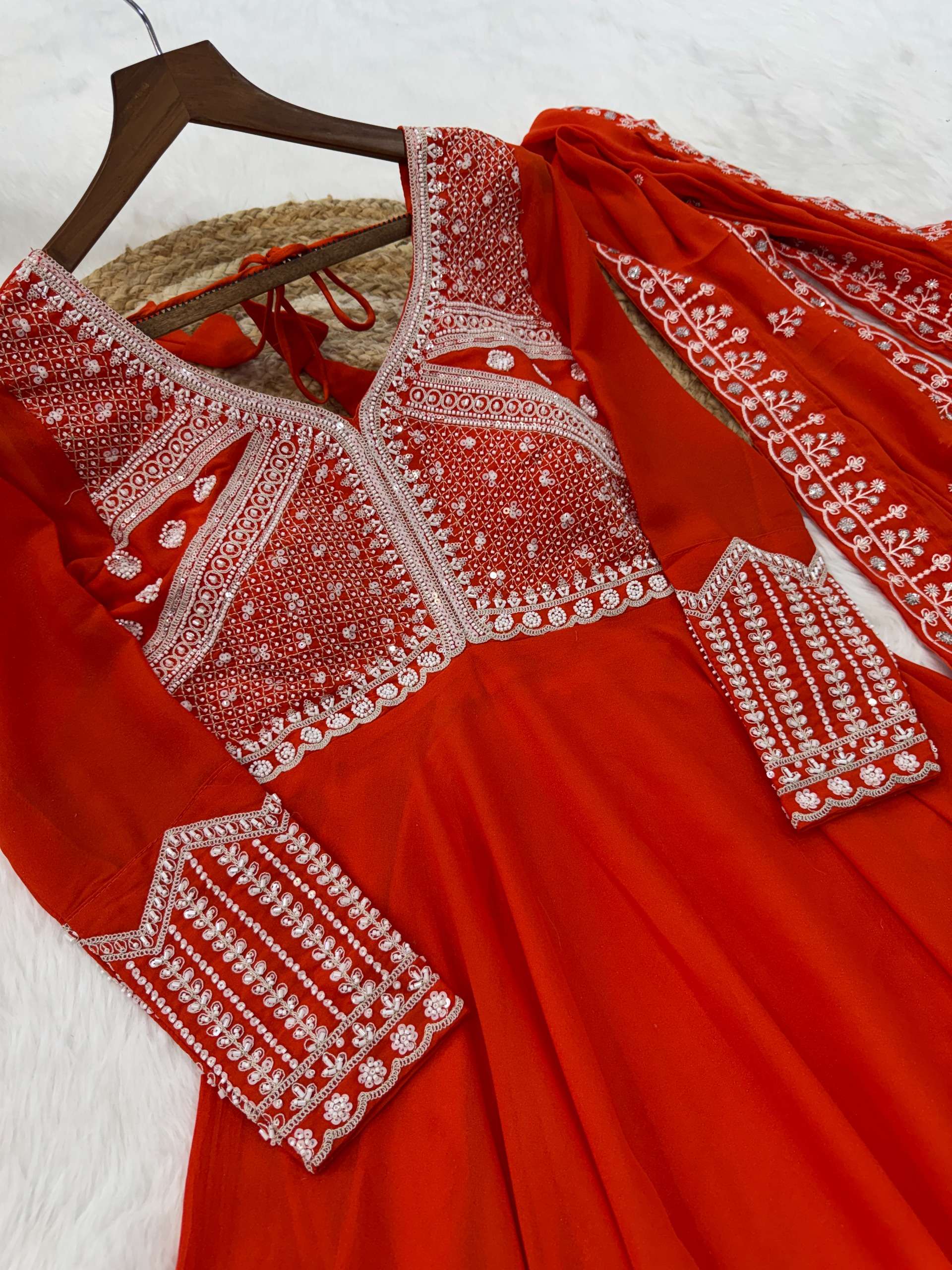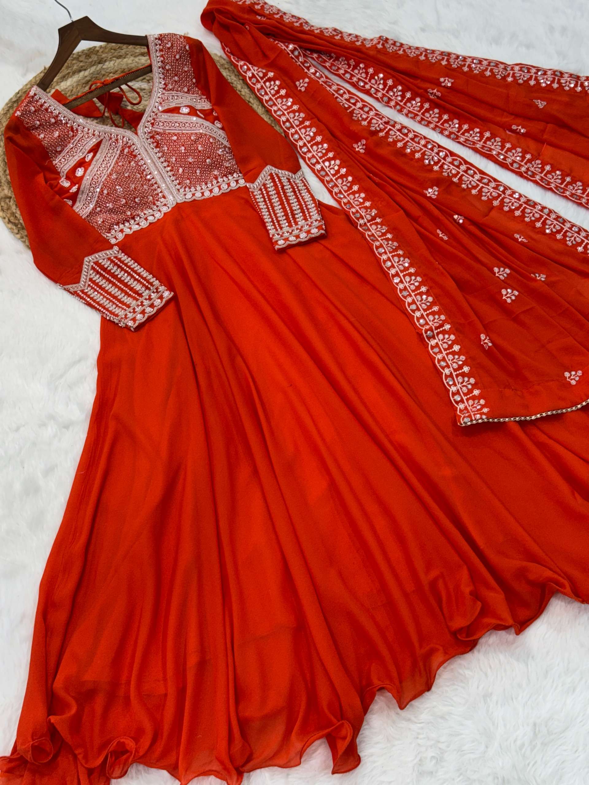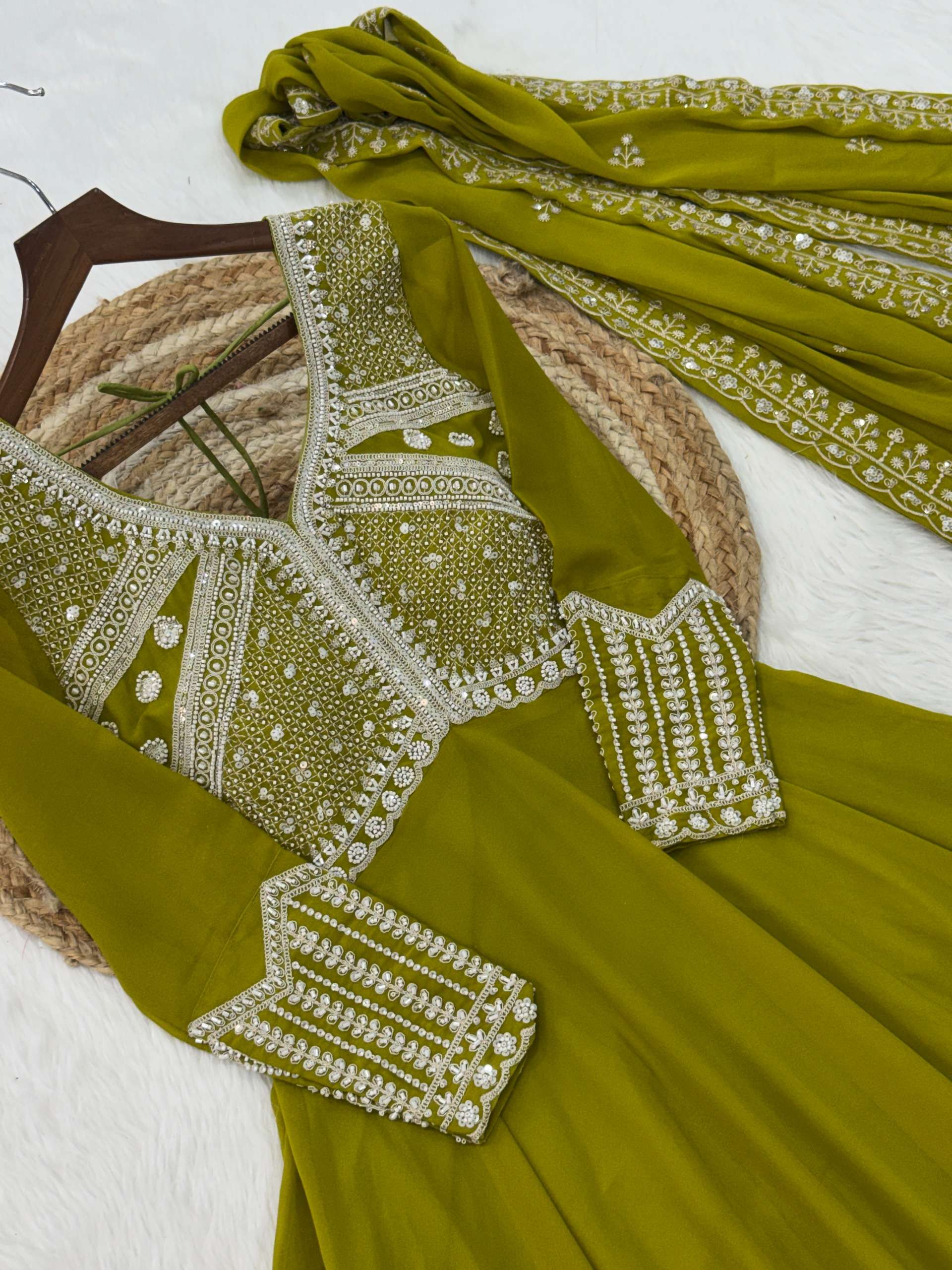 *GOWN* :- 👇🏻 *FABRICS & WORK* :- Star Georgette With Rich Sequins Coding & Beads Embroidered work *SIZE* :- M(38"), L(40"), XL(42"), XXL(44") *LENGTH* :- 54-55 INCH *FLAIR* :- 5 MTR (Umbrella Flair) *LINING* :- Cotton (Full Inner Top To Bottom) *SLEEVES* :- Full Sleeves *NECK TYPE* :- Fancy V Neck *STITCHING TYPE* :- Wire Stitching
