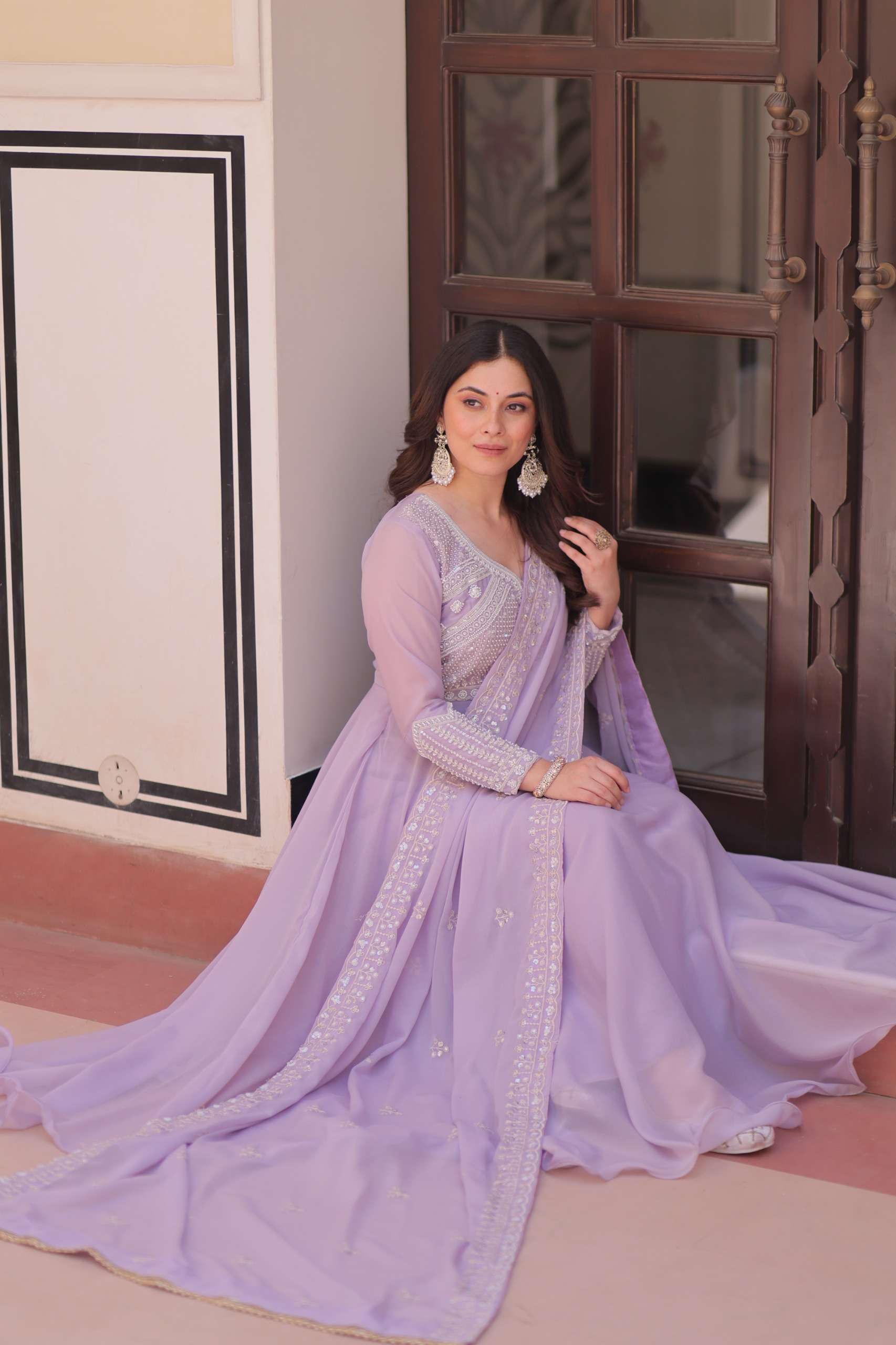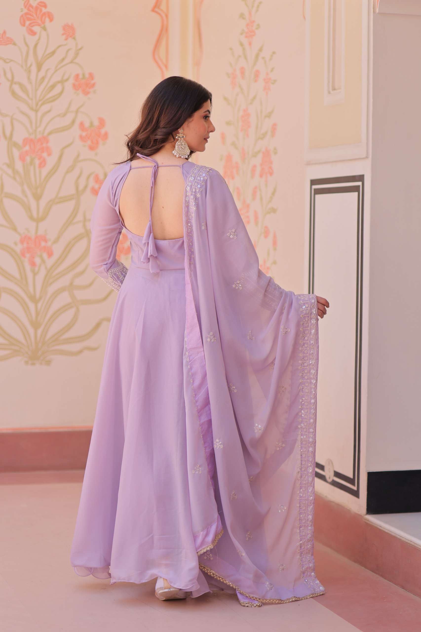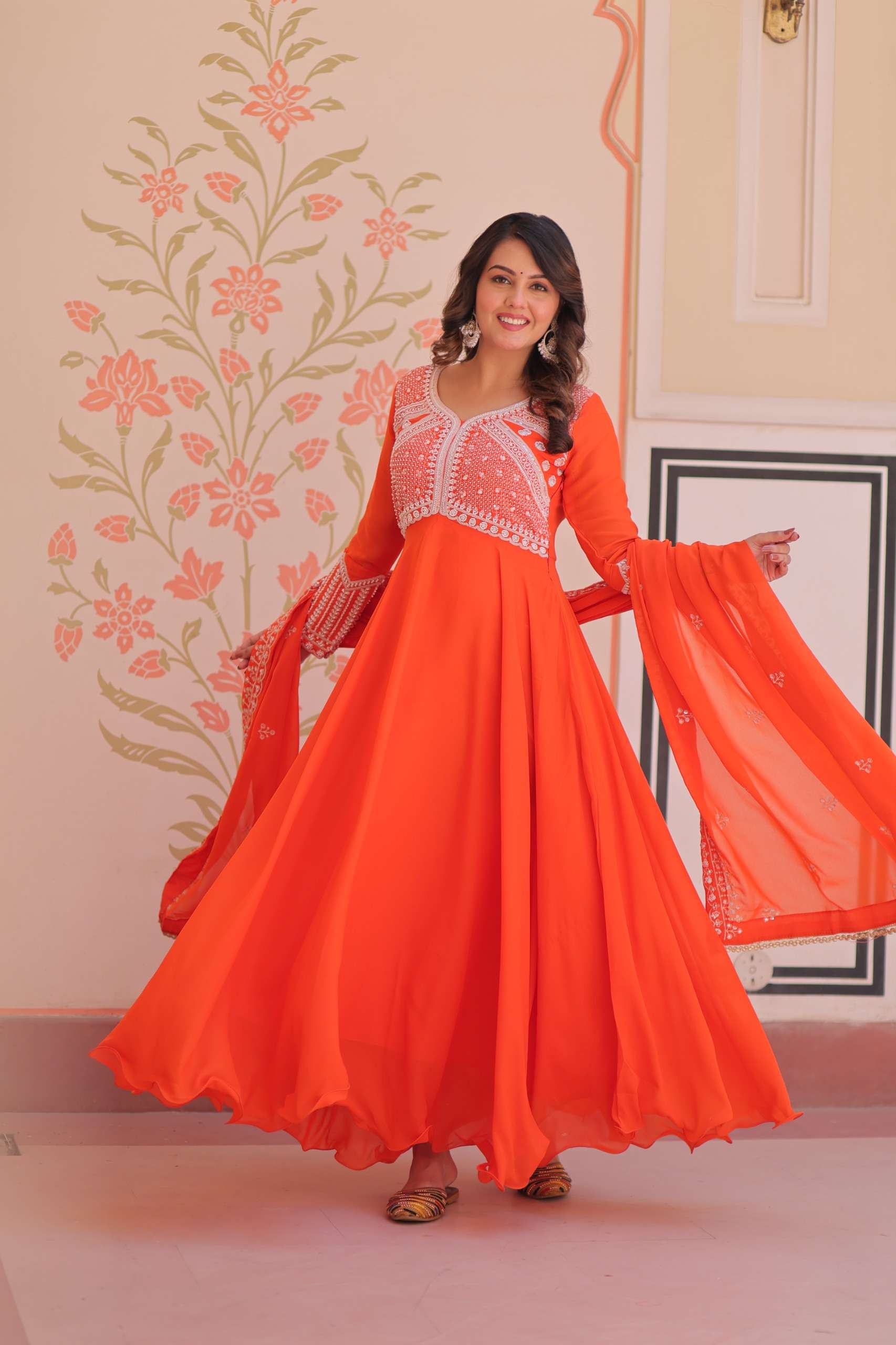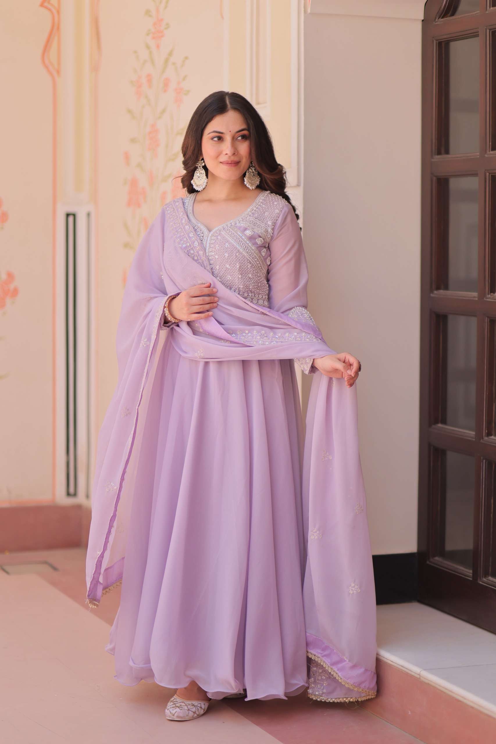*GOWN* :- 👇🏻 *FABRICS & WORK* :- Star Georgette With Rich Sequins Coding & Beads Embroidered work *SIZE* :- M(38"), L(40"), XL(42"), XXL(44") *LENGTH* :- 54-55 INCH *FLAIR* :- 5 MTR (Umbrella Flair) *LINING* :- Cotton (Full Inner Top To Bottom) *SLEEVES* :- Full Sleeves *NECK TYPE* :- Fancy V Neck *STITCHING TYPE* :- Wire Stitching
