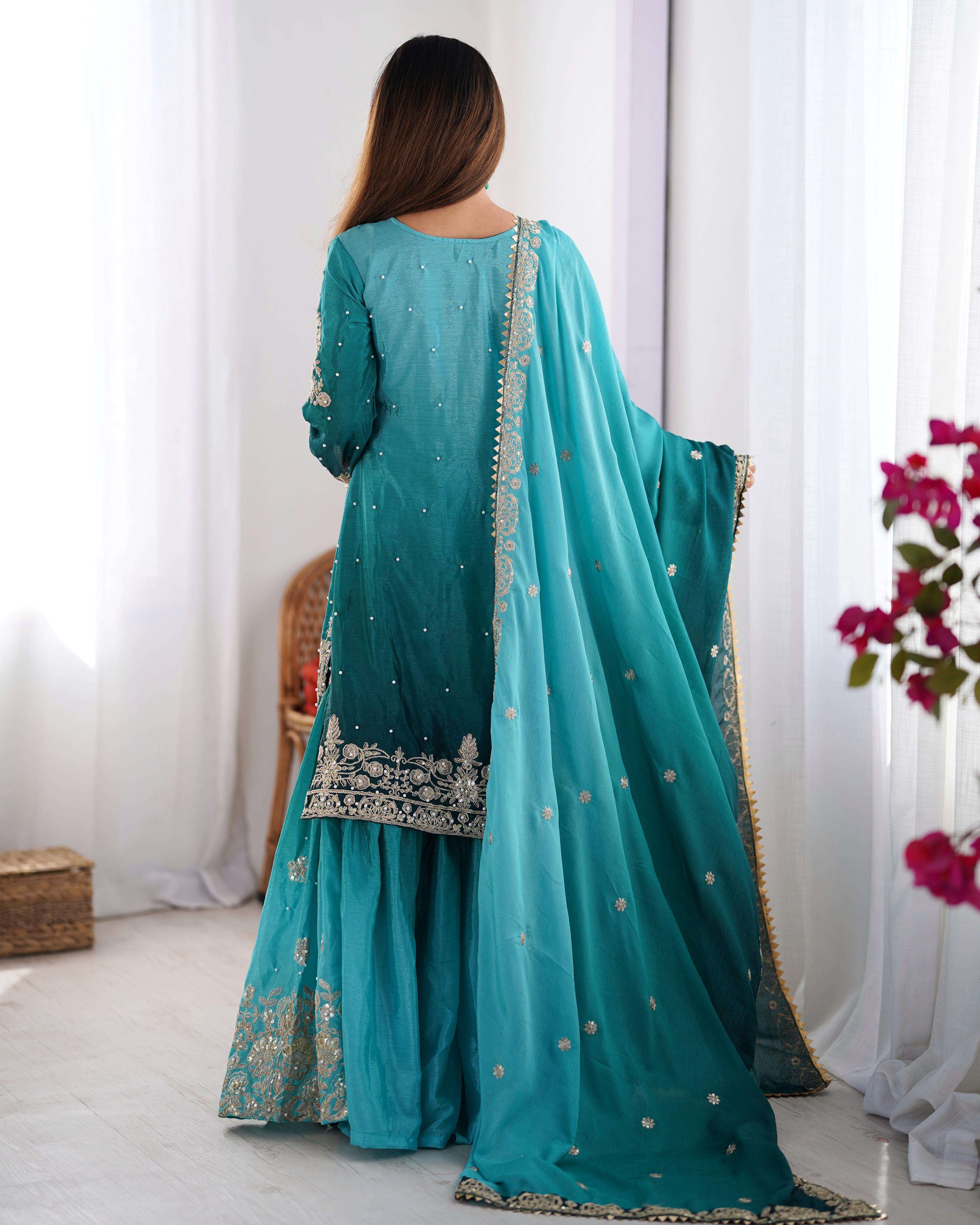 *Fabric*. :- Chinon silk *Work*. :- Codeing Dori with Sequnce with River moti *Length*. :- 2.2 meter
