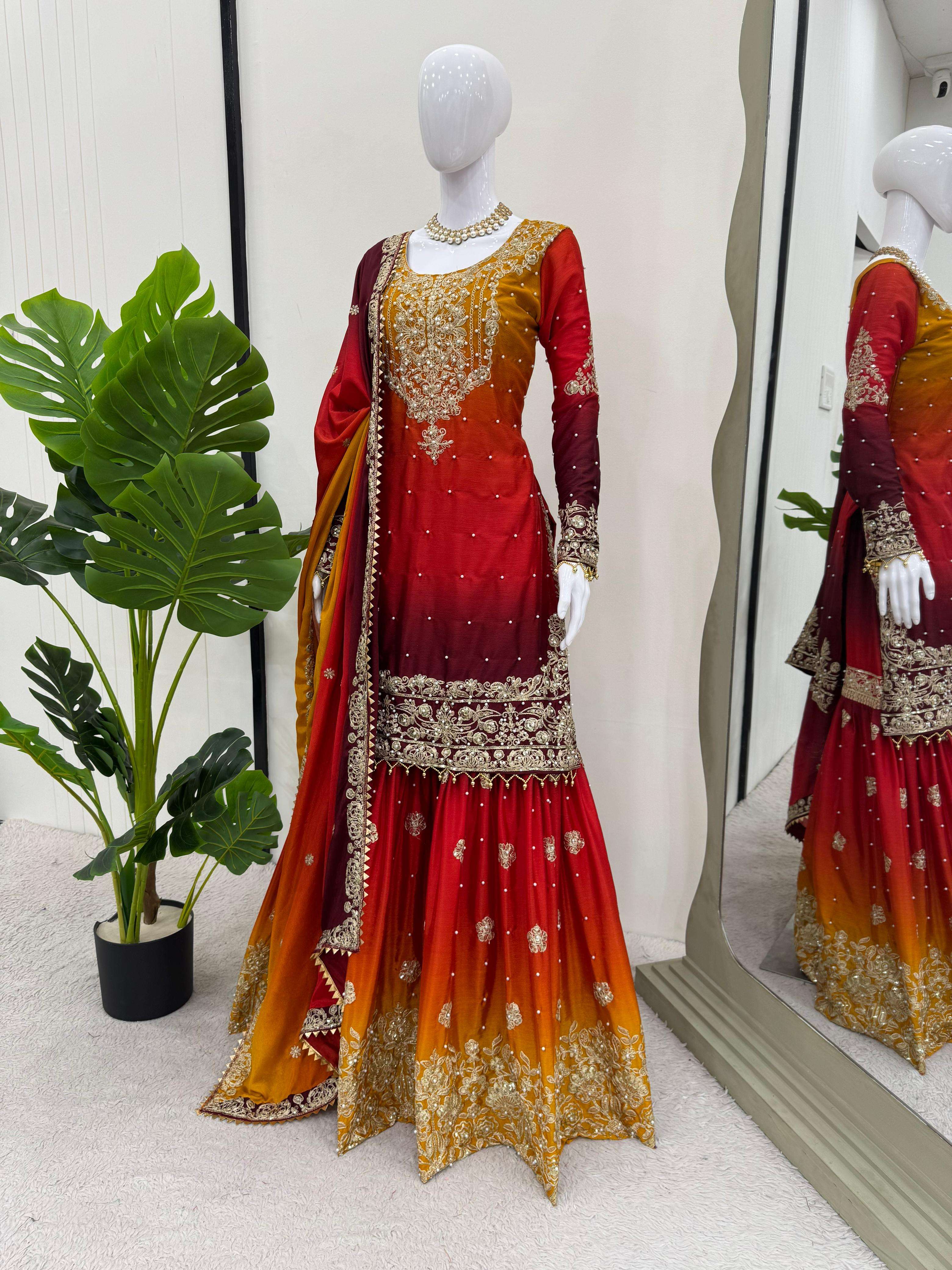 *Fabric* :- Chinon silk *Inner*. :- Micro *Work*. :- Codeing Dori with Sequnce with River moti *Stich* :- Full stich upto 44 with elastic