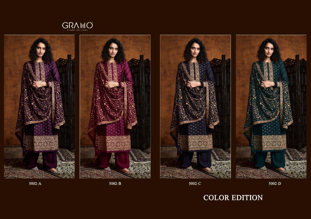 Buy Online Color Edition Series 5002 By Gramo Readymade Suit Single And Set Stockiest And Supplier From Surat 4 Pcs of Full Catalogue at Wholesale Price. Looking for Color Edition Series 5002 By Gramo Readymade Suit Single And Set Stockiest And Supplier From Surat Full Catalouge at Best Price? Buy Now Color Edition Series 5002 By Gramo Readymade Suit Single And Set Stockiest And Supplier From Surat at Wholesale Rate of Rs 7180 with Total 4 Pcs from authroized dealer and supplier of Brand. Cost of Each piece is just only Rs 1795 which is very low and affordable price to resale the product in your retail store ,This is Surat based Wholesale Supplier & Dealer of Brand. Click on Brand name to Know more about Brand's products.Call or Whatsapp on 9898838984 for booking or enquiry