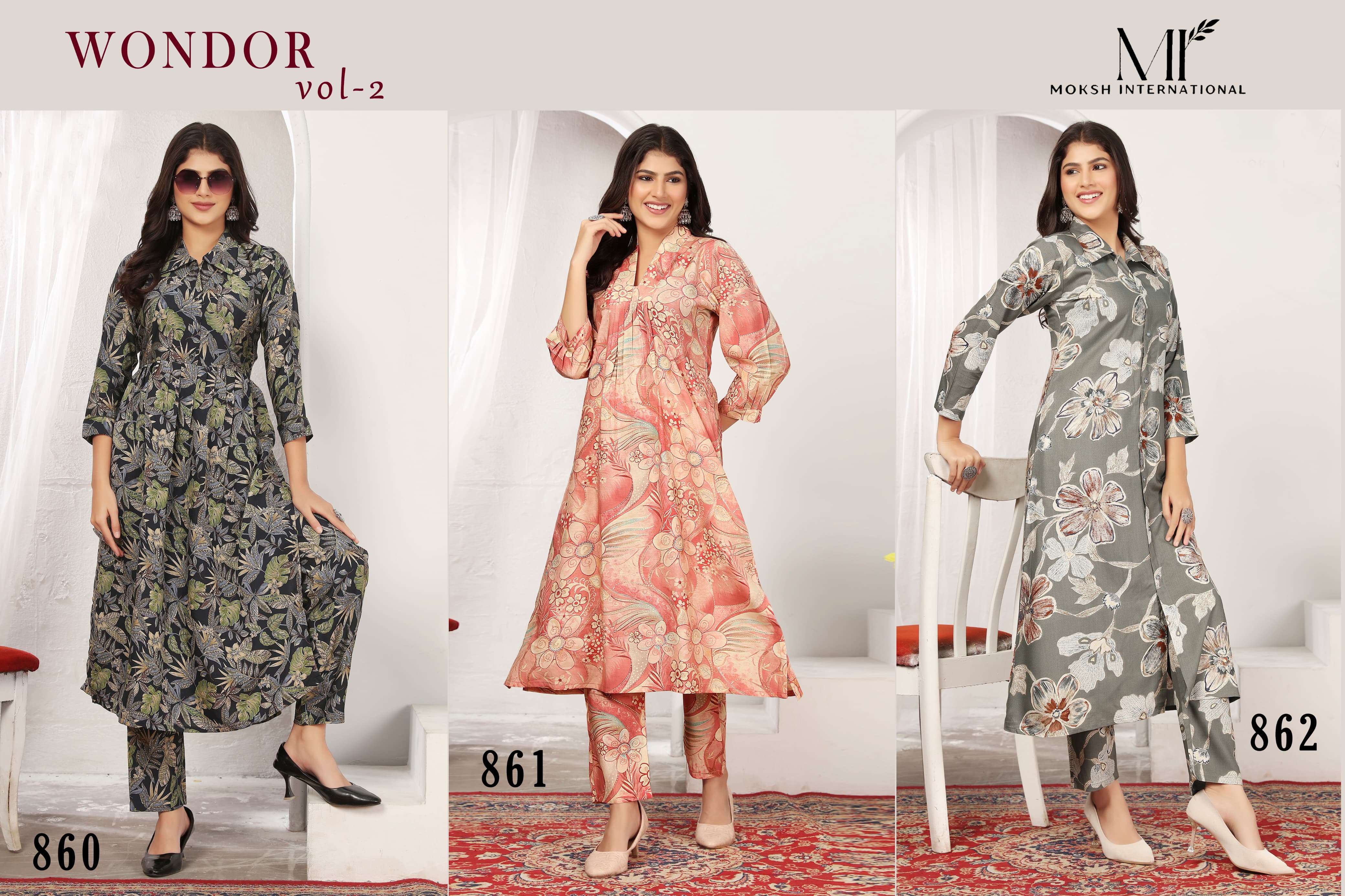 Buy Online Coord set WONDOR VOL 2 D No 860 And 862 by Moksh International kurti collection manufacturer surat 3 Pcs of Full Catalogue at Wholesale Price. Looking for Coord set WONDOR VOL 2 D No 860 And 862 by Moksh International kurti collection manufacturer surat Full Catalouge at Best Price? Buy Now Coord set WONDOR VOL 2 D No 860 And 862 by Moksh International kurti collection manufacturer surat at Wholesale Rate of Rs 2850 with Total 3 Pcs from authroized dealer and supplier of MOKSH INTERNATIONAL Brand. Cost of Each piece is just only Rs 950 which is very low and affordable price to resale the product in your retail store ,This is Surat based Wholesale Supplier & Dealer of MOKSH INTERNATIONAL Brand. Click on Brand name to Know more about MOKSH INTERNATIONAL Brand's products.Call or Whatsapp on 9898838984 for booking or enquiry