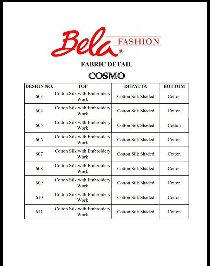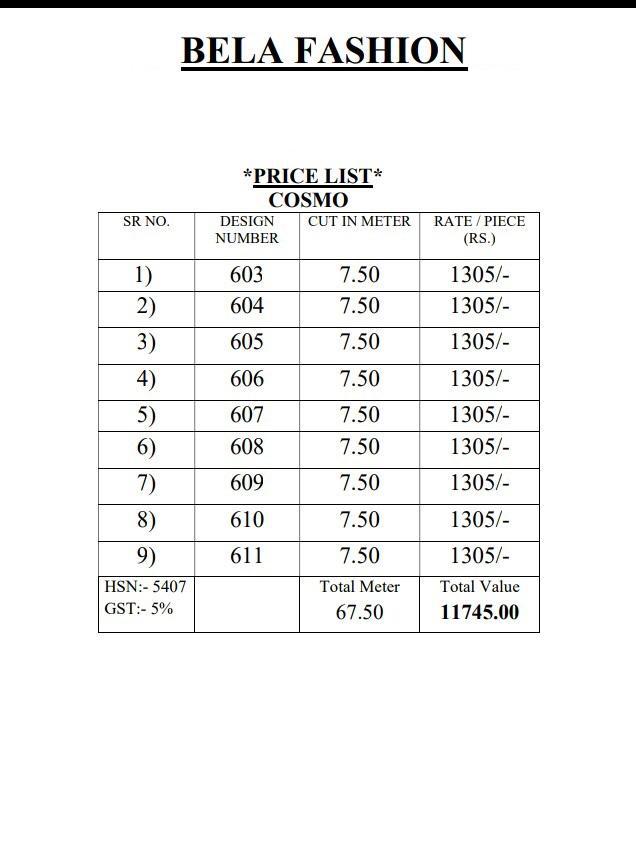 Buy Online Cosmo By Bela Series 603 To 611 Designer Party Wear Suits Wholesale Supplier Gujarat 9 Pcs of Full Catalogue at Wholesale Price. Looking for Cosmo By Bela Series 603 To 611 Designer Party Wear Suits Wholesale Supplier Gujarat Full Catalouge at Best Price? Buy Now Cosmo By Bela Series 603 To 611 Designer Party Wear Suits Wholesale Supplier Gujarat at Wholesale Rate of Rs 11745 with Total 9 Pcs from authroized dealer and supplier of BELA Brand. Cost of Each piece is just only Rs 1305 which is very low and affordable price to resale the product in your retail store ,This is Surat based Wholesale Supplier & Dealer of BELA Brand. Click on Brand name to Know more about BELA Brand's products.Call or Whatsapp on 9898838984 for booking or enquiry