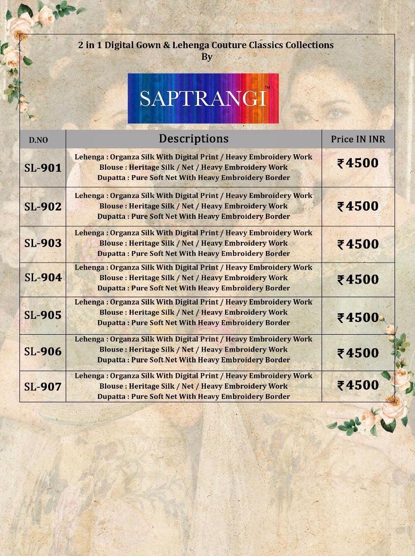 Buy Online Couture Classic By Saptarangi 901 Series Designer Party Wear Organza Silk Digital Printed 2 In 1 Lehenga Gown Collection Wholesaler Surat 7 Pcs of Full Catalogue at Wholesale Price. Looking for Couture Classic By Saptarangi 901 Series Designer Party Wear Organza Silk Digital Printed 2 In 1 Lehenga Gown Collection Wholesaler Surat Full Catalouge at Best Price? Buy Now Couture Classic By Saptarangi 901 Series Designer Party Wear Organza Silk Digital Printed 2 In 1 Lehenga Gown Collection Wholesaler Surat at Wholesale Rate of Rs 31500 with Total 7 Pcs from authroized dealer and supplier of SAPTARANGI Brand. Cost of Each piece is just only Rs 4500 which is very low and affordable price to resale the product in your retail store ,This is Surat based Wholesale Supplier & Dealer of SAPTARANGI Brand. Click on Brand name to Know more about SAPTARANGI Brand's products.Call or Whatsapp on 9898838984 for booking or enquiry