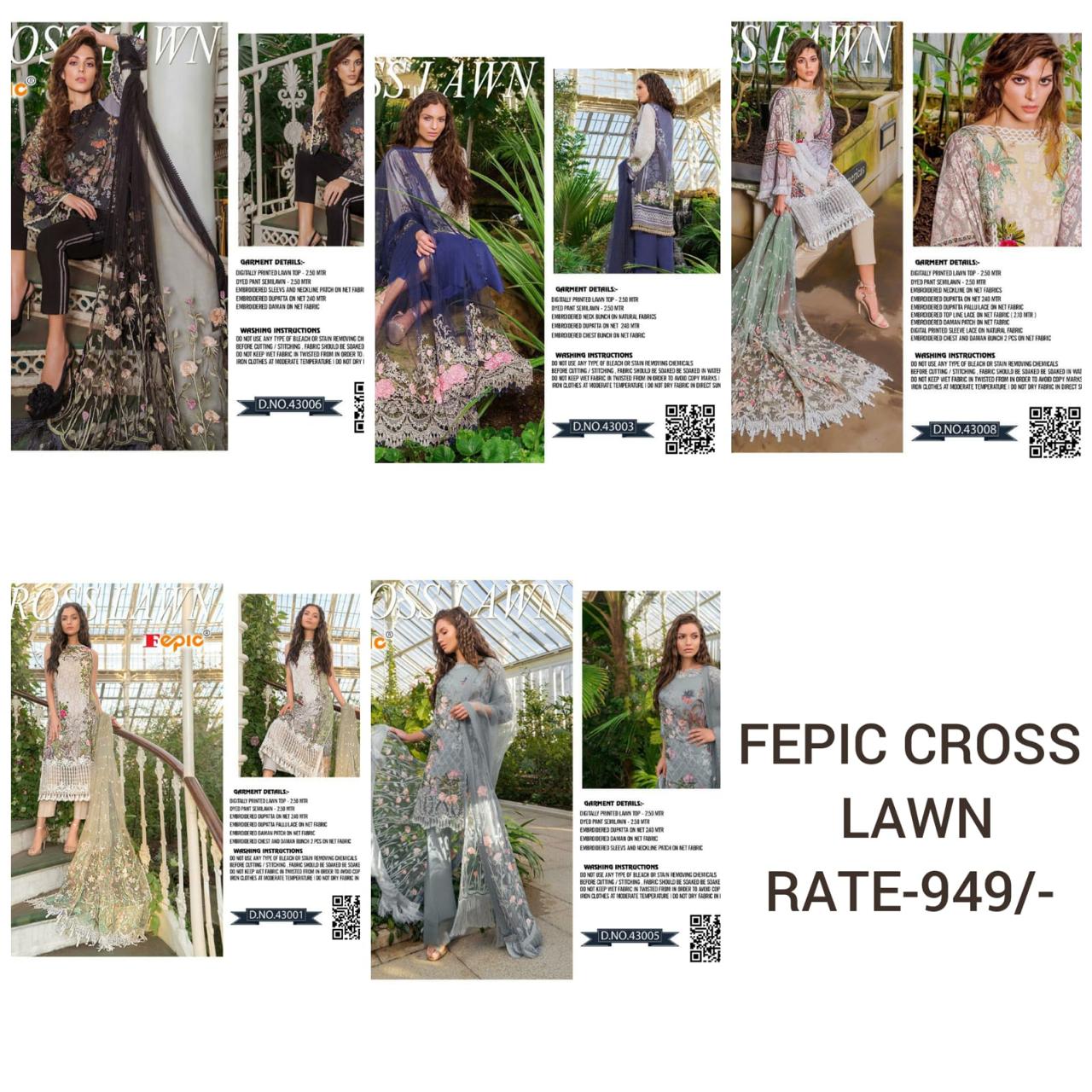 Brand - Fepic . Catlog name - Cross lawn Nx . Rate -949 per pcs . *Singles*? ? extra 100 * Set & Loose & Singel * GST 5 Percent Extra. Delivery 2-3 days |