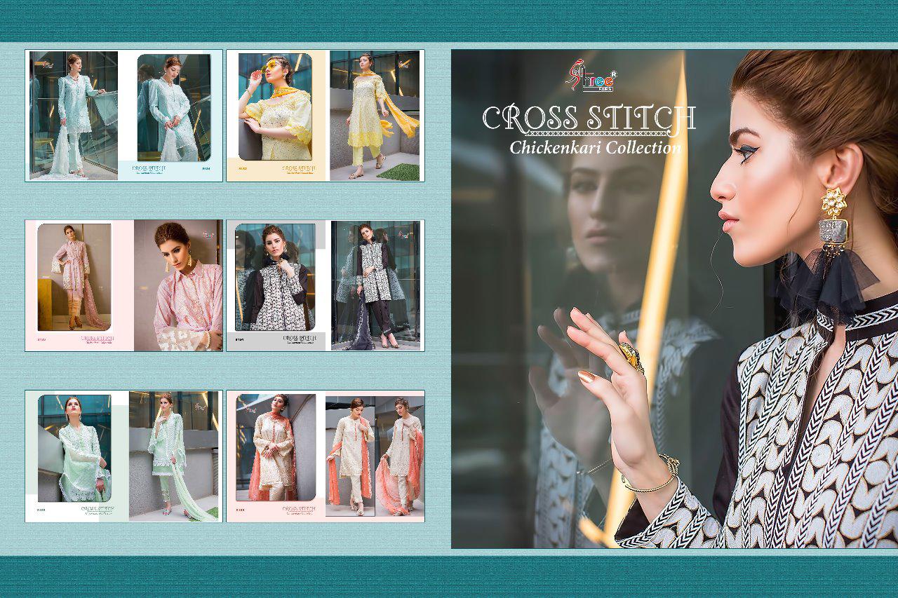 CROSS STITCH CHICKENKARI COLLECTION Top pure cotton with self embrodery ( sifly work ) Bottom semilawn Duppta najmin siffon with heavy embrodery Rate 899+ gst Shree fabs surat |