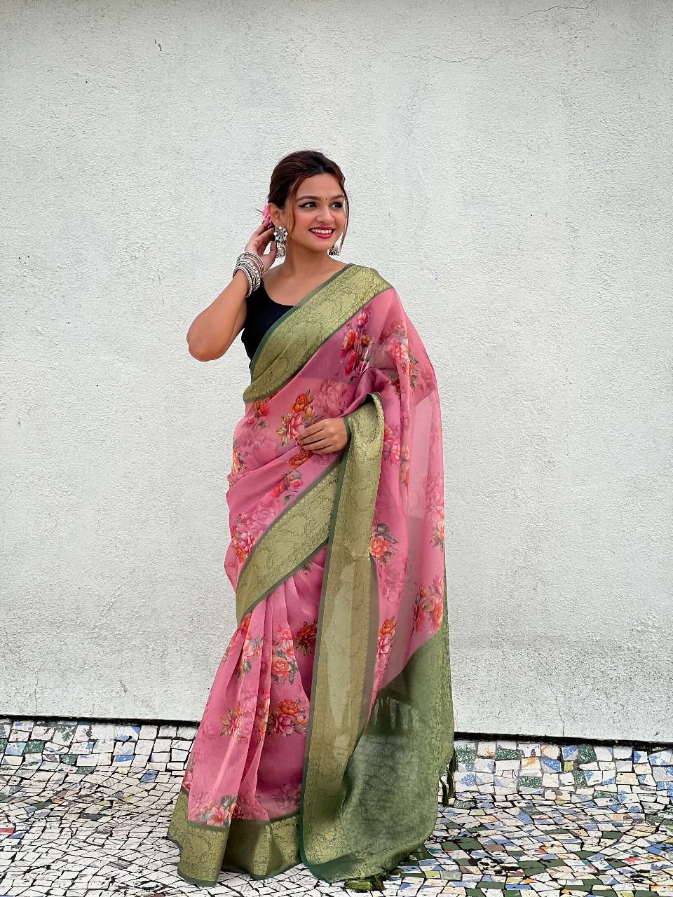 Soft Crush Tissue Sarees with Floral prints all over the body having zari woven border on both sides Rich jacquard zari woven Pallu with Tassels. Paired with Running Tissue Blouse.