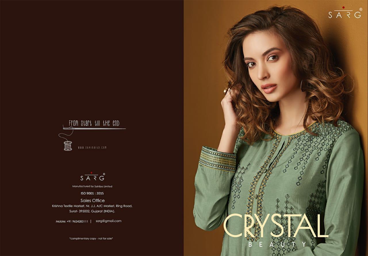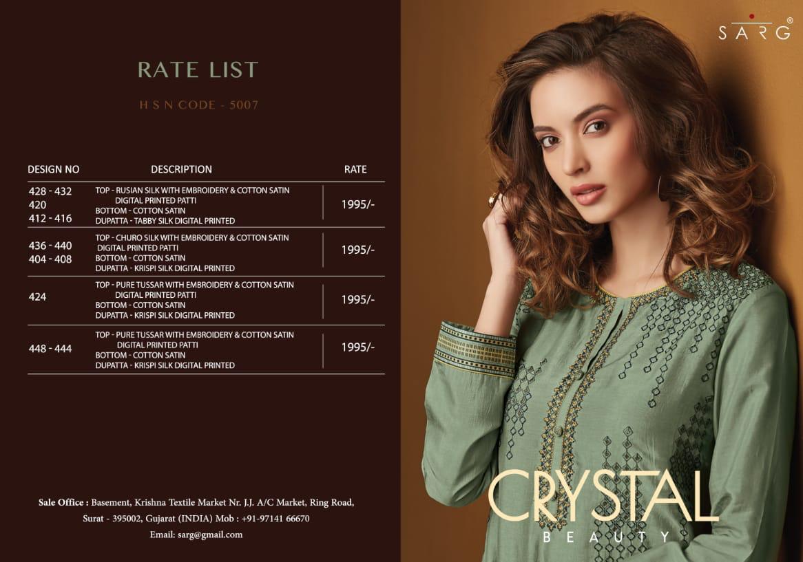 Buy Online Crystal Beauty By Sarg Fancy Party Wear Salwar Kameez Catlog Wholesale Dealer Surat 12 Pcs of Full Catalogue at Wholesale Price. Looking for Crystal Beauty By Sarg Fancy Party Wear Salwar Kameez Catlog Wholesale Dealer Surat Full Catalouge at Best Price? Buy Now Crystal Beauty By Sarg Fancy Party Wear Salwar Kameez Catlog Wholesale Dealer Surat at Wholesale Rate of Rs 23940 with Total 12 Pcs from authroized dealer and supplier of SARG Brand. Cost of Each piece is just only Rs 1995 which is very low and affordable price to resale the product in your retail store ,This is Surat based Wholesale Supplier & Dealer of SARG Brand. Click on Brand name to Know more about SARG Brand's products.Call or Whatsapp on 9898838984 for booking or enquiry