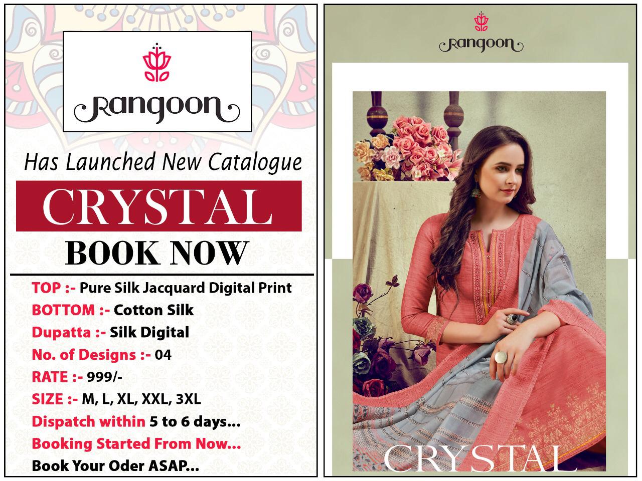 Buy Online Crystal By Rangoon Dress Materials Wholesale Supplier And Dealer Gujarat 4 Pcs of Full Catalogue at Wholesale Price. Looking for Crystal By Rangoon Dress Materials Wholesale Supplier And Dealer Gujarat Full Catalouge at Best Price? Buy Now Crystal By Rangoon Dress Materials Wholesale Supplier And Dealer Gujarat at Wholesale Rate of Rs 3996 with Total 4 Pcs from authroized dealer and supplier of RANGOON Brand. Cost of Each piece is just only Rs 999 which is very low and affordable price to resale the product in your retail store ,This is Surat based Wholesale Supplier & Dealer of RANGOON Brand. Click on Brand name to Know more about RANGOON Brand's products.Call or Whatsapp on 9898838984 for booking or enquiry