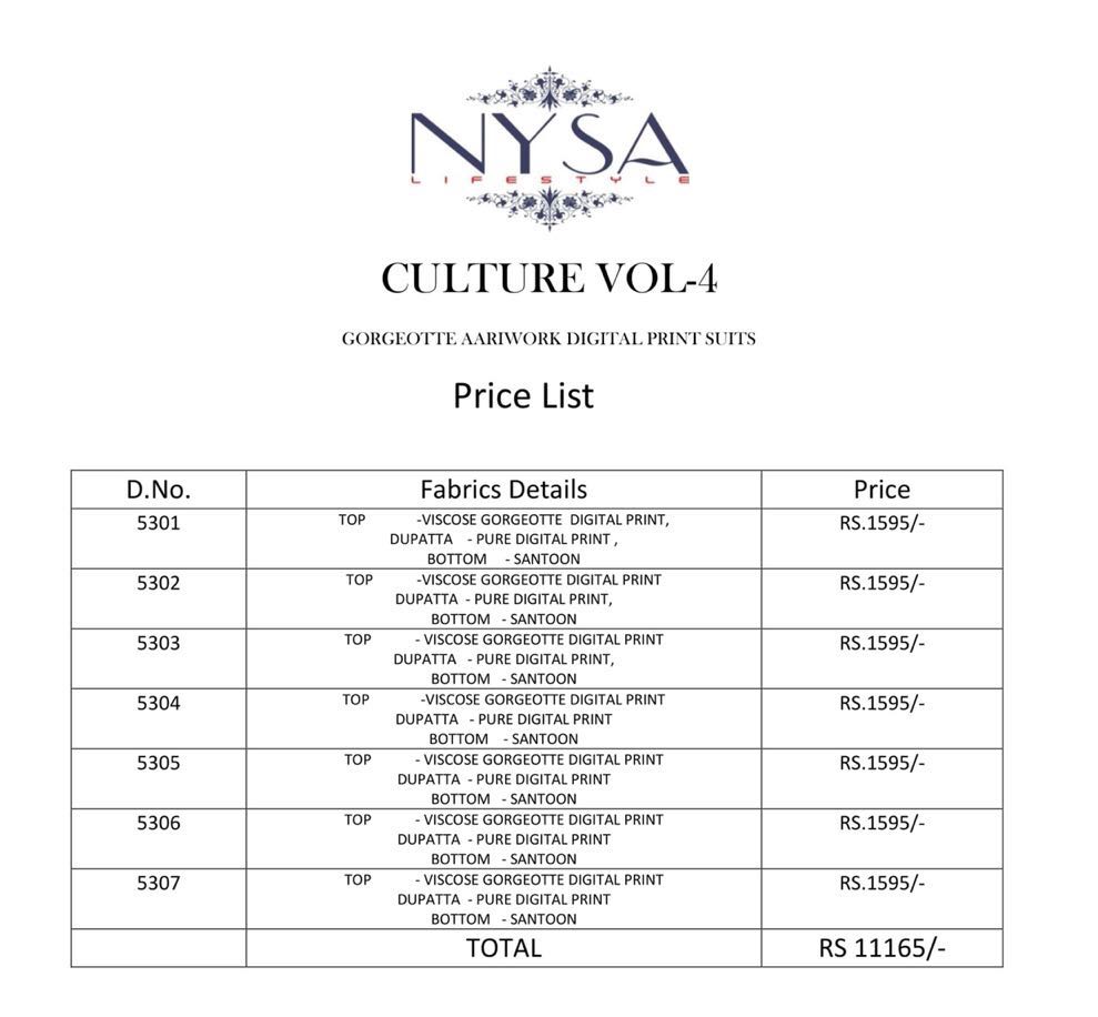 Brand - NYSYA LIFESTYLE. Catlog name - CULTURAE Vol -4. Set to set . GST 5 Percent Extra. Delivery-17-08-18. Book your order |