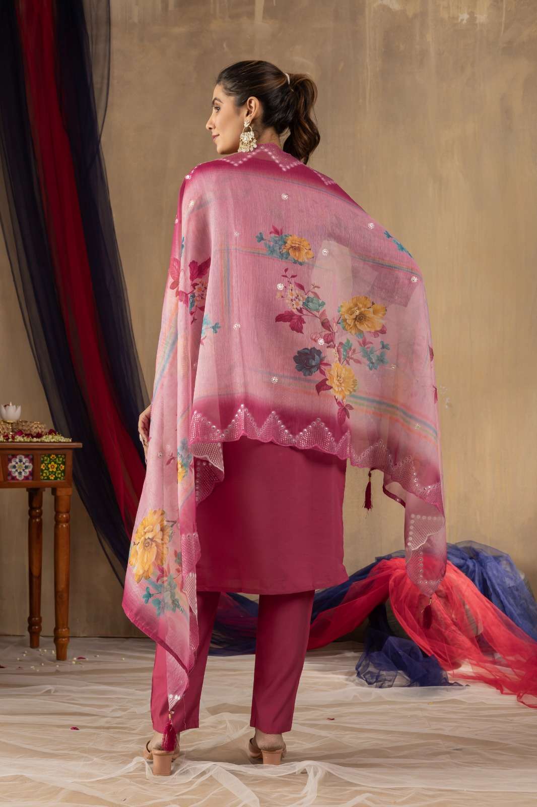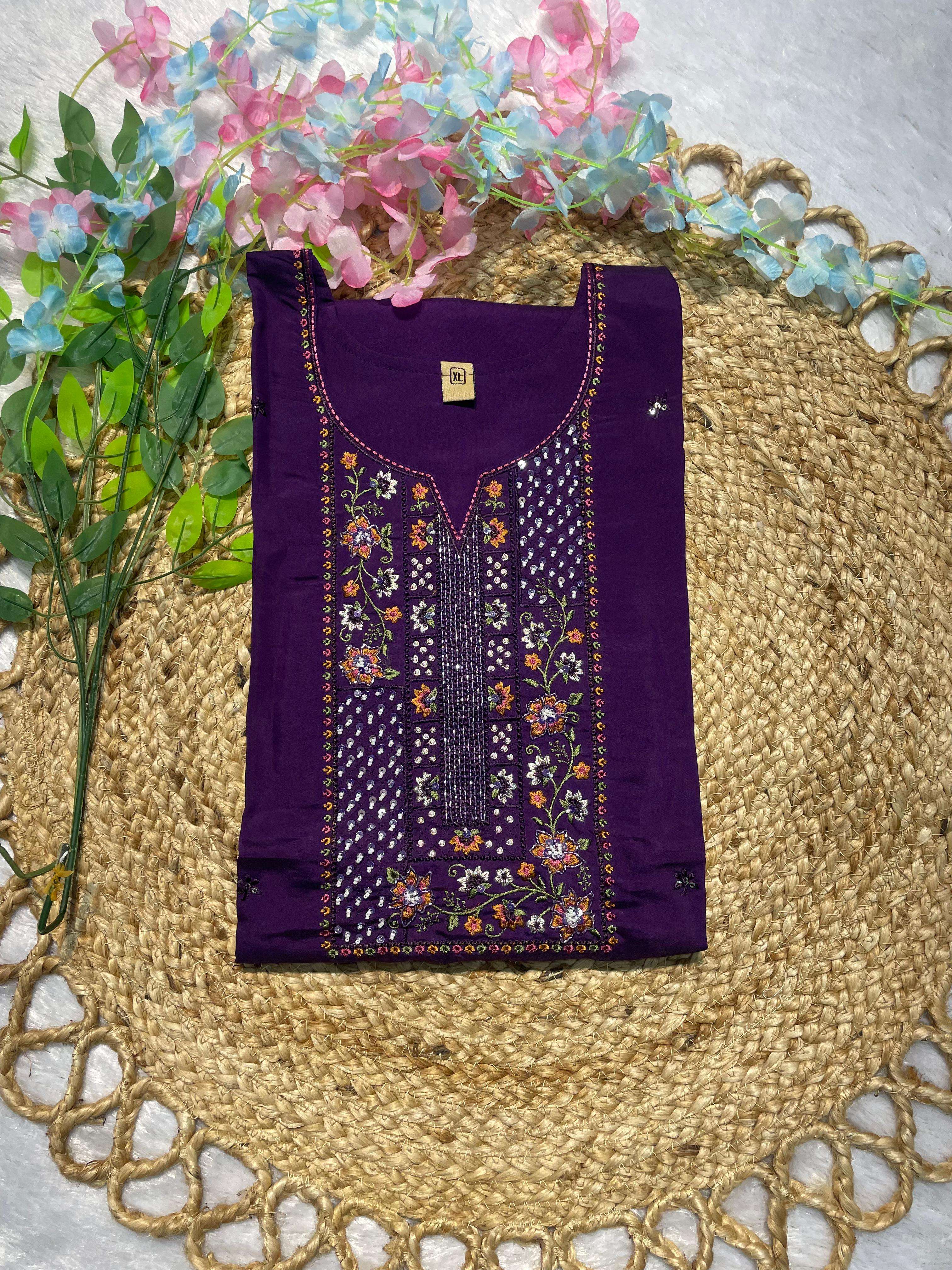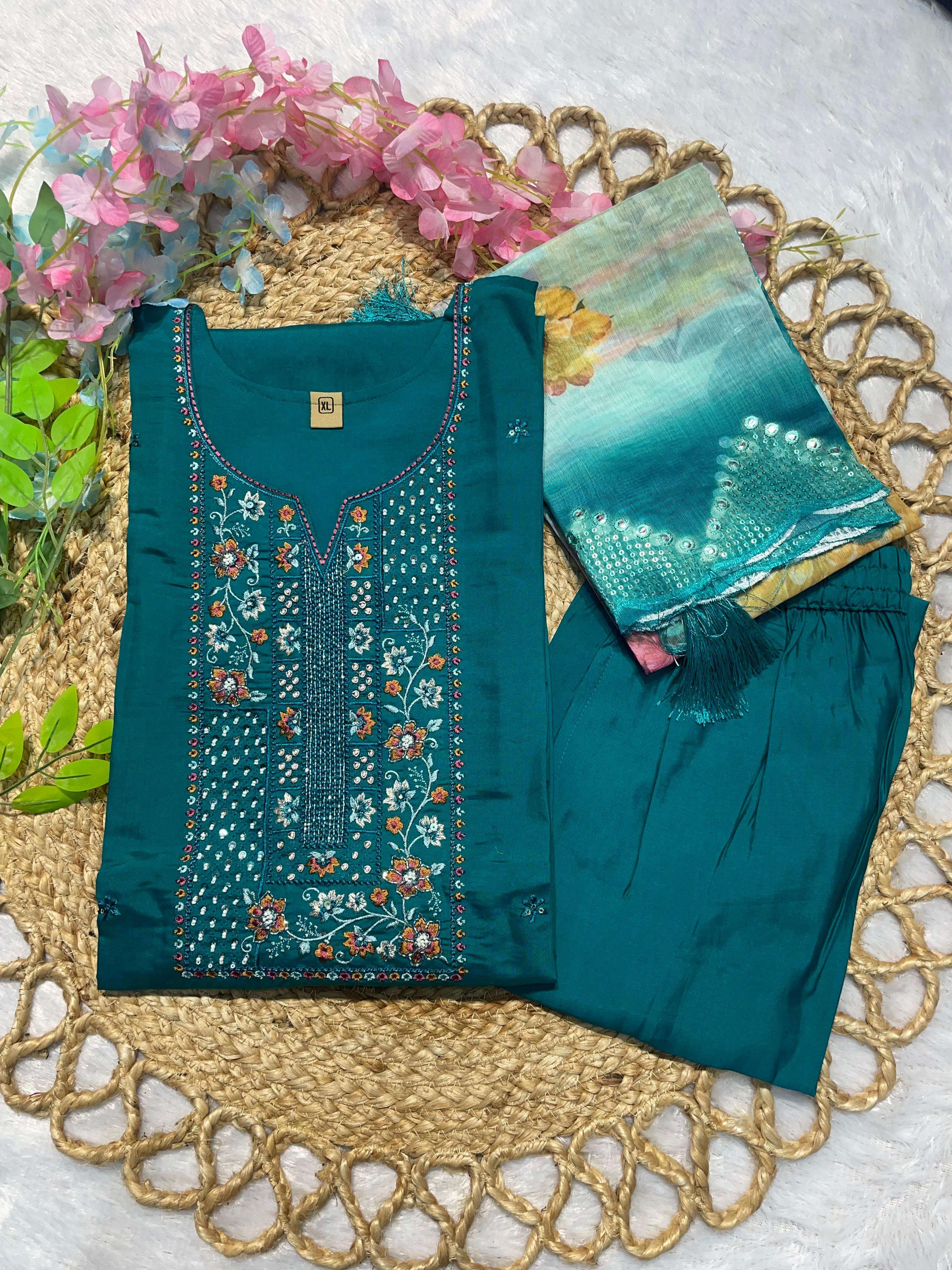 *Dupatta* Fabric :- Chanderi silk Work :- Digital Print,Embroidery Sequins Work With Mirror Work Length :- 2.25 Meter Package Contains :- Kurti, Pant, Dupatta Weight: 0.600gm COLOUR:- 4 (Purple,pink,Rama Green, Black)