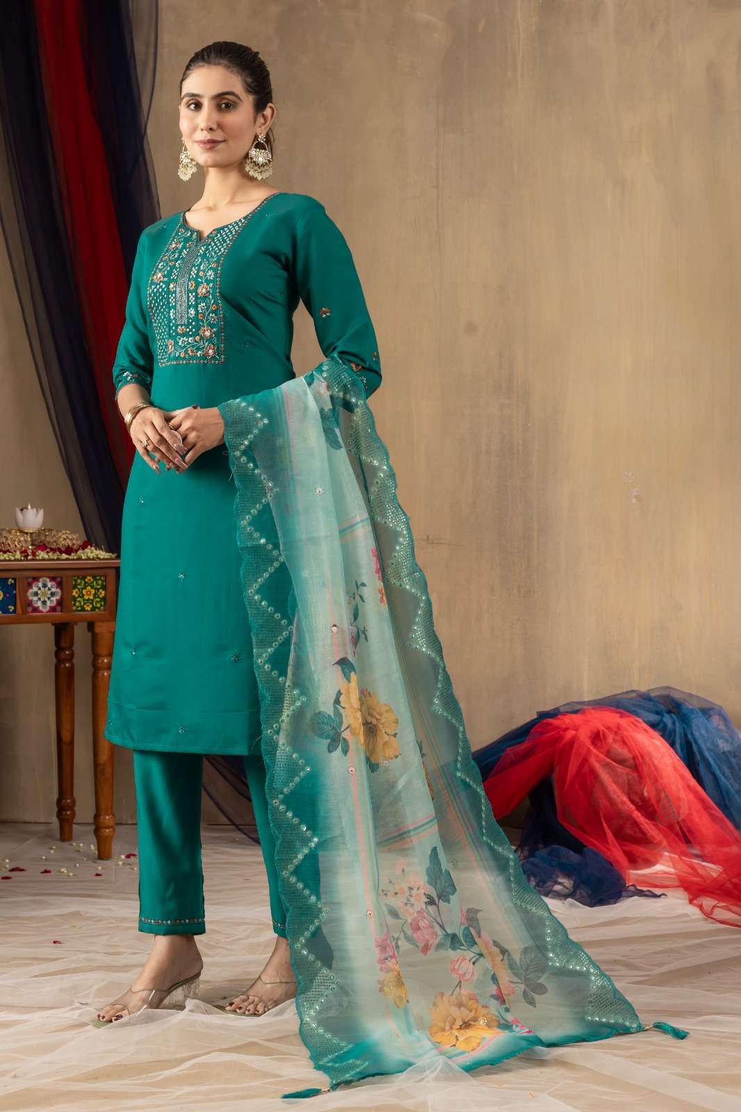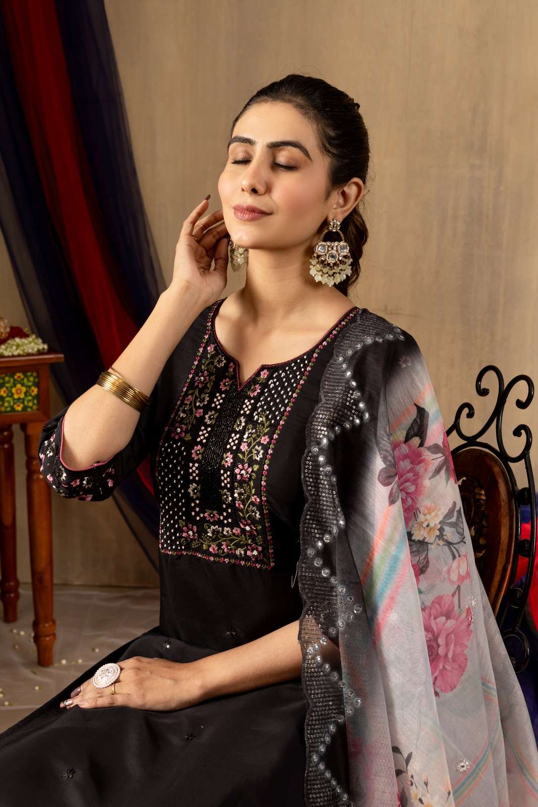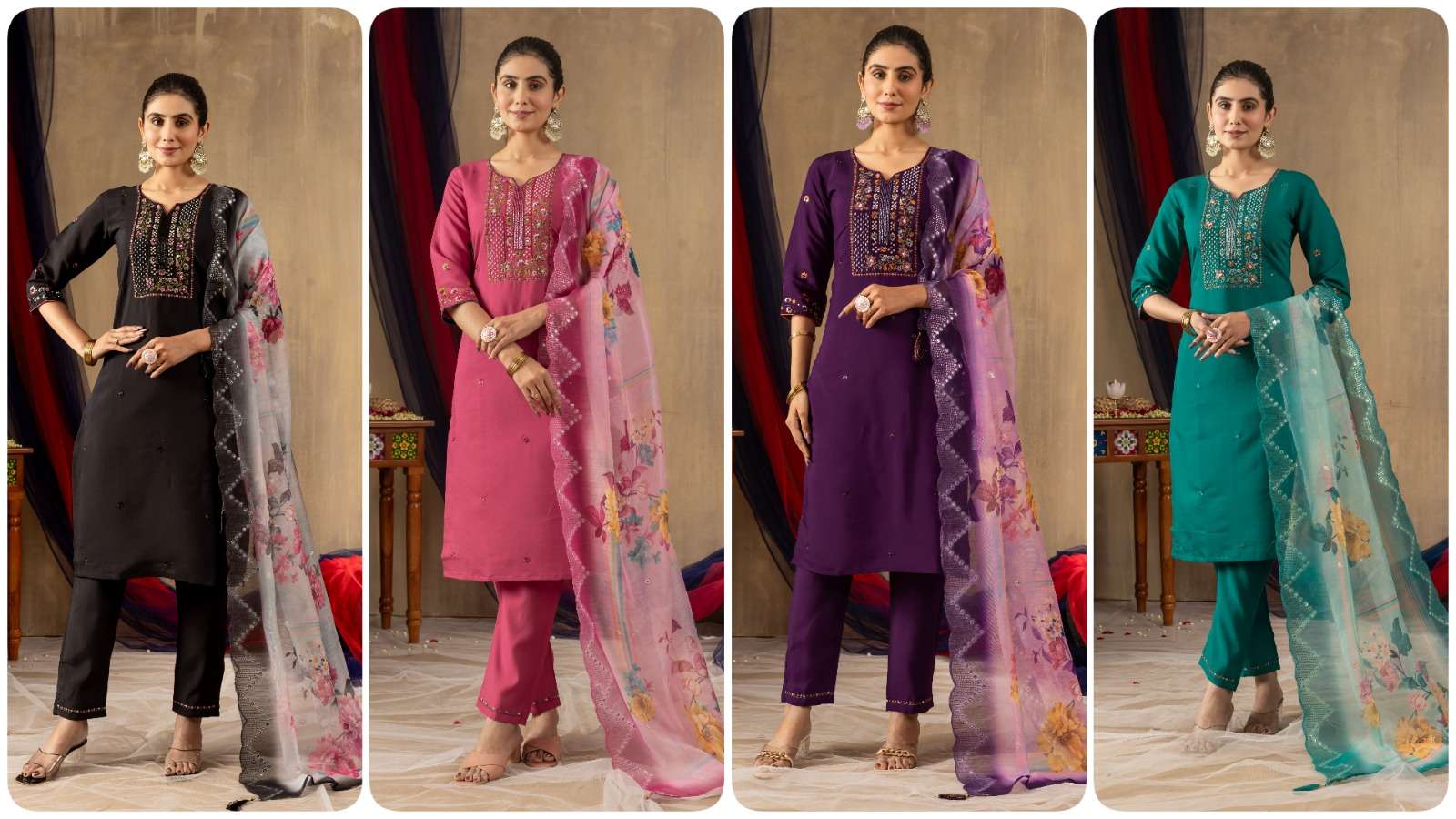 *Dupatta* Fabric :- Chanderi silk Work :- Digital Print,Embroidery Sequins Work With Mirror Work Length :- 2.25 Meter Package Contains :- Kurti, Pant, Dupatta Weight: 0.600gm COLOUR:- 4 (Purple,pink,Rama Green, Black)