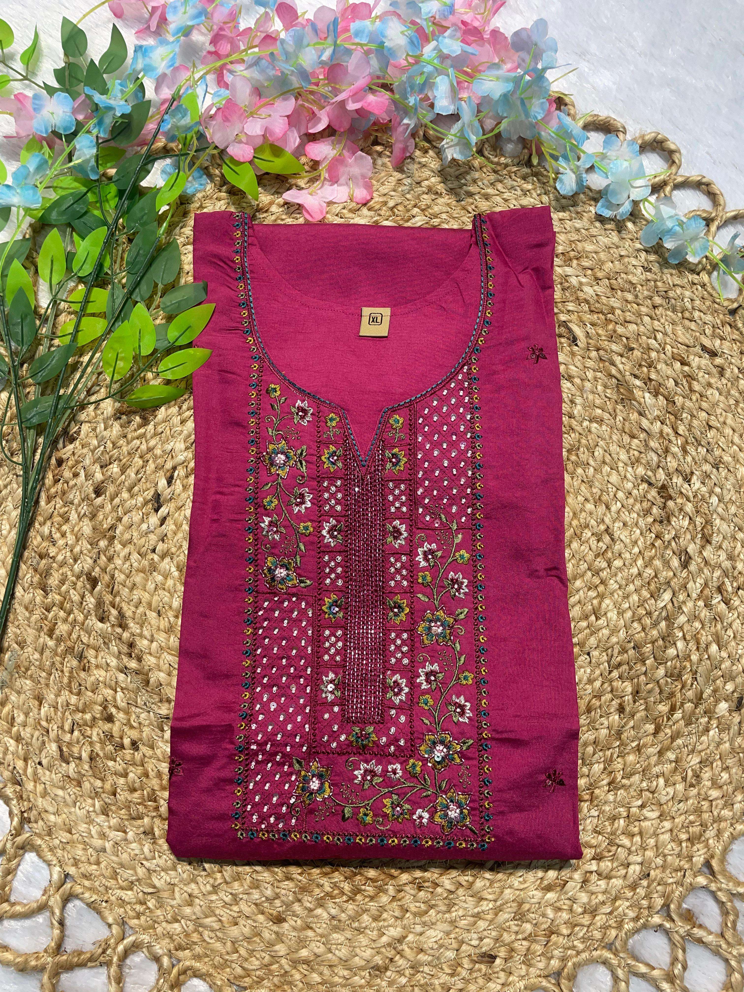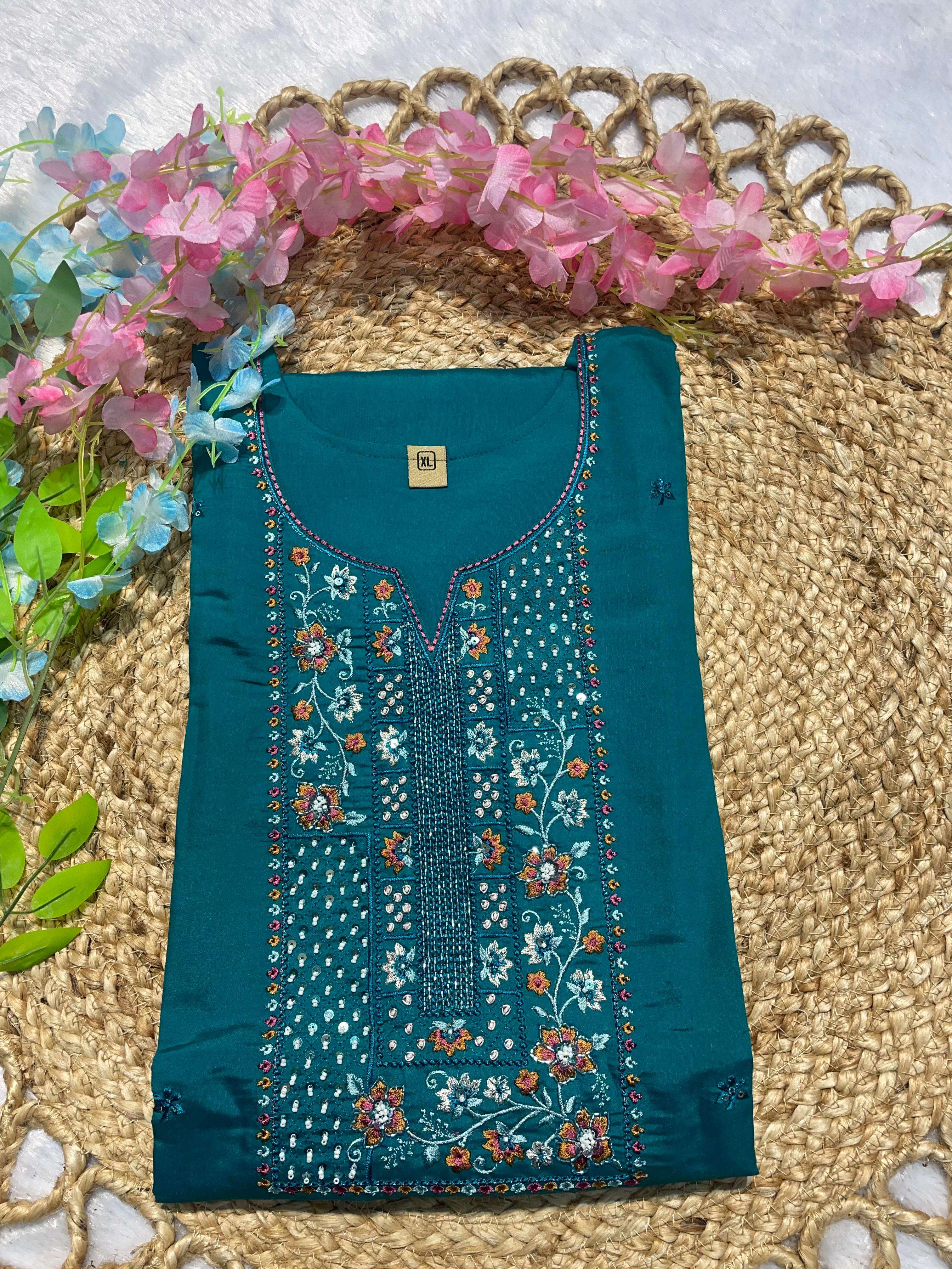 *D-108* *Kurti (Stitched)* Fabric :- Roman Silk Work :- Multi Embroidery Thread With Hand Work Chest Size :- M(38”),L(40”),XL(42”),2XL(44”),3XL(46”) Length :- 46” Sleeve Length :- 16”