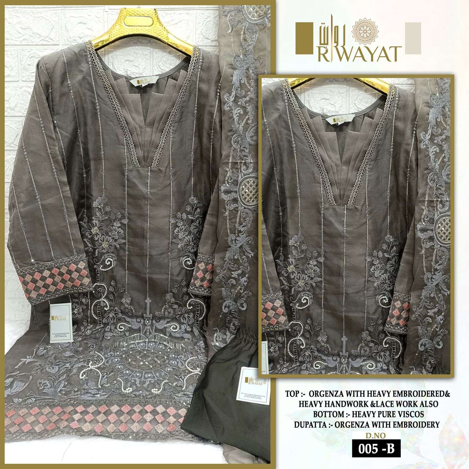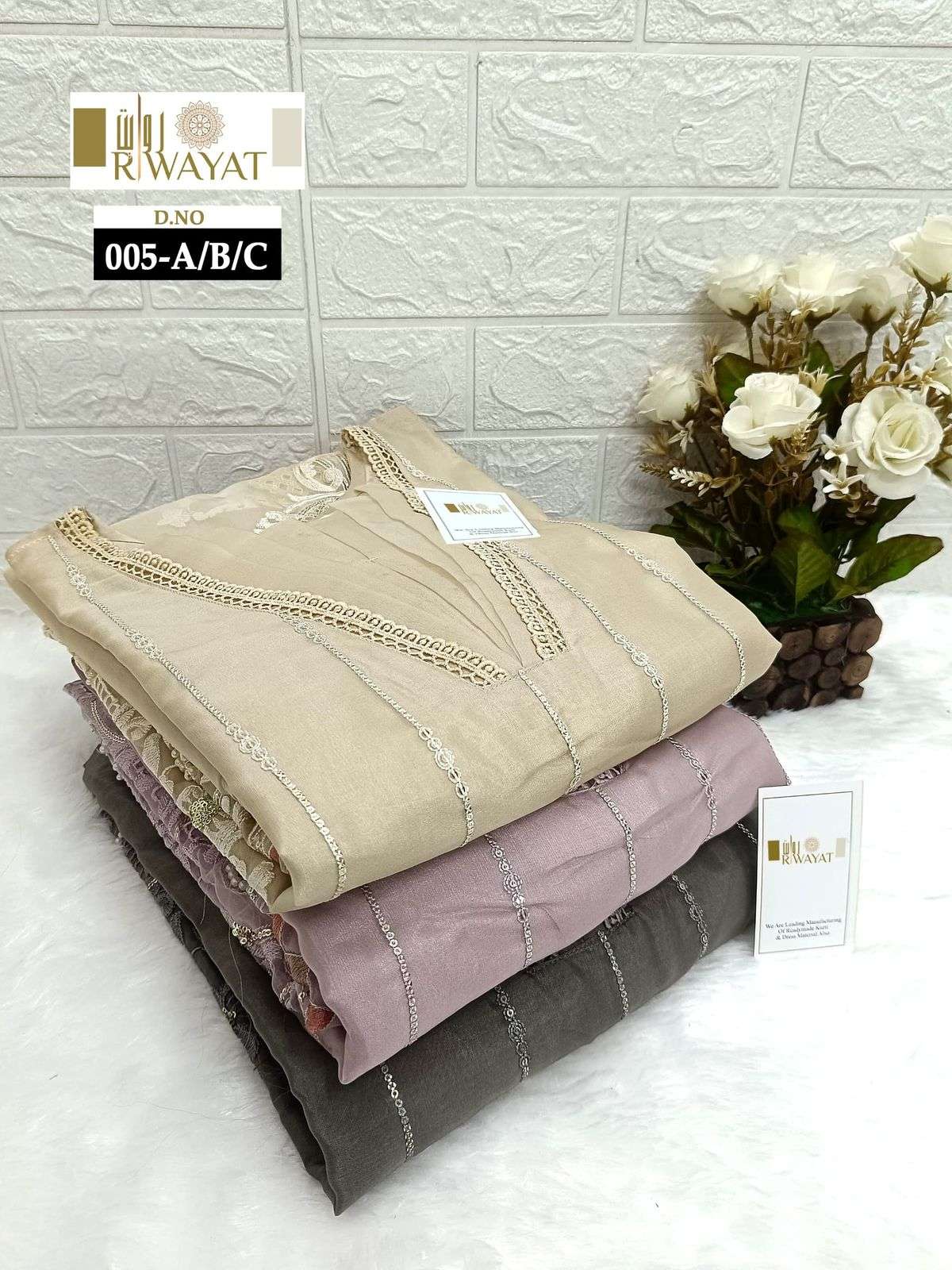 Buy Online D no 005 A B C by RIWAYAT ORGENZA READYMADE kurti collection manufacturer surat 3 Pcs of Full Catalogue at Wholesale Price. Looking for D no 005 A B C by RIWAYAT ORGENZA READYMADE kurti collection manufacturer surat Full Catalouge at Best Price? Buy Now D no 005 A B C by RIWAYAT ORGENZA READYMADE kurti collection manufacturer surat at Wholesale Rate of Rs 3747 with Total 3 Pcs from authroized dealer and supplier of BRAND'S Brand. Cost of Each piece is just only Rs 1249 which is very low and affordable price to resale the product in your retail store ,This is Surat based Wholesale Supplier & Dealer of BRAND'S Brand. Click on Brand name to Know more about BRAND'S Brand's products.Call or Whatsapp on 9898838984 for booking or enquiry