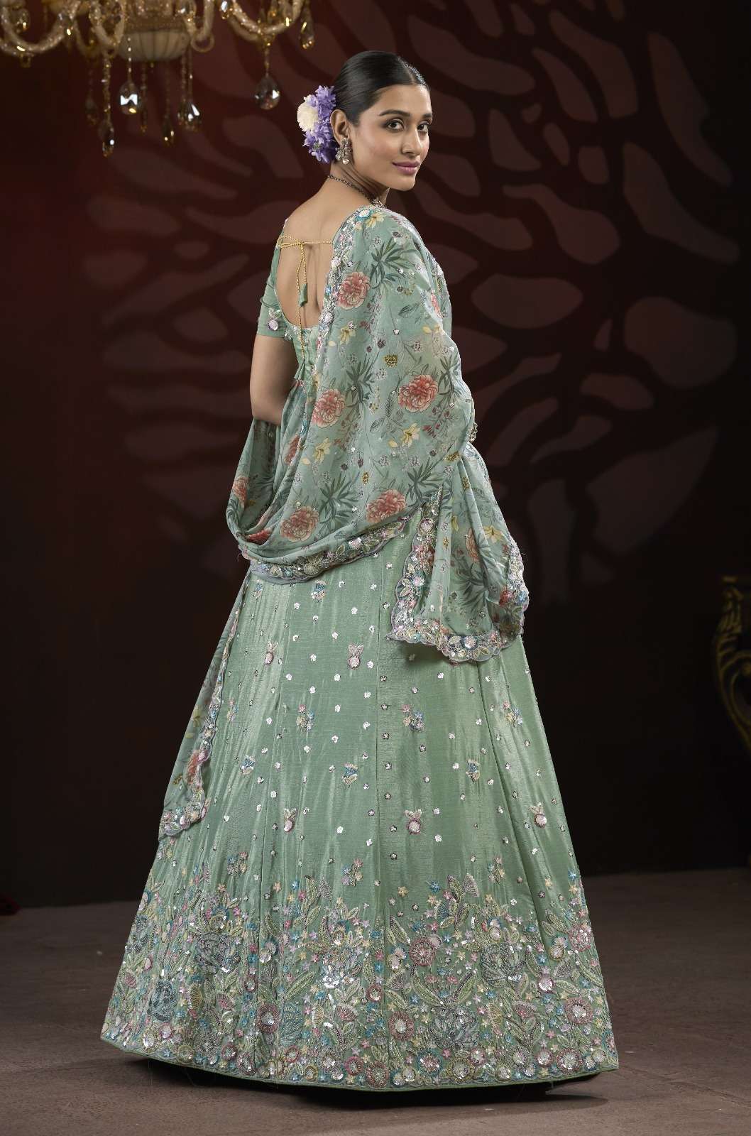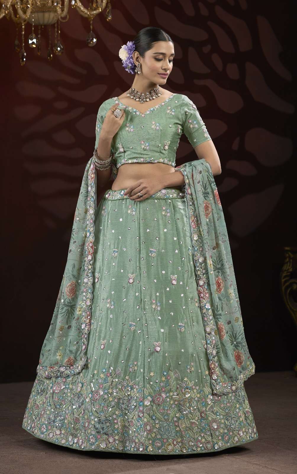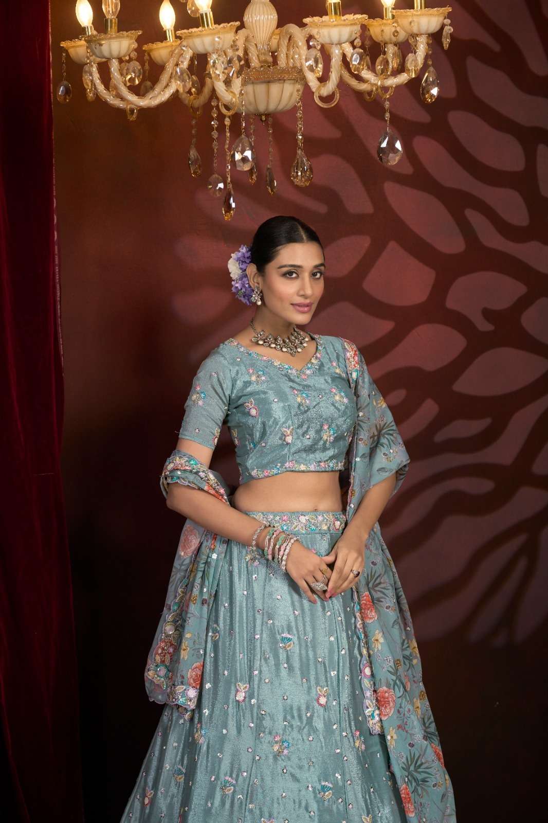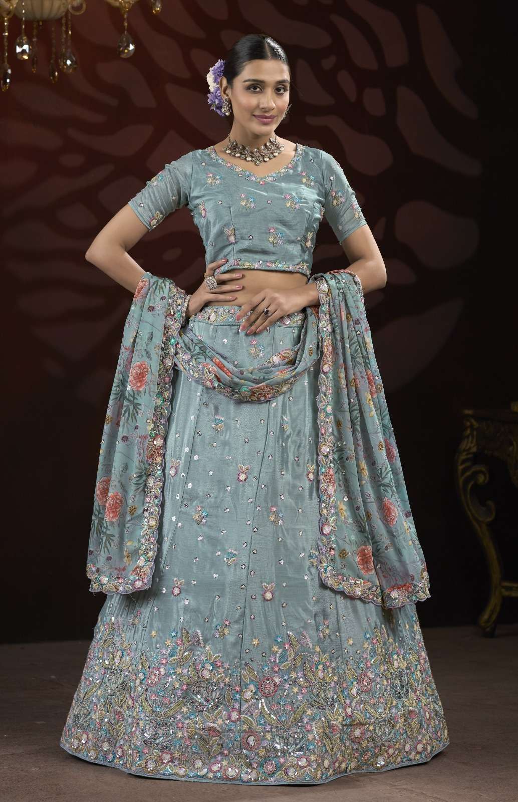 BRAND NAME – ANJANI ART D.NO. 1085 TO 1090 Lehenga Fabric – Bridal Net Blouse fabric - Heavy Chinnon Inner - Heavy Chinnon Dupatta – Georgette Work - Four Types of Sequins Embroidery, fancy Embroidery Work, Thread embroidery, Flower pattern Print Dupatta Weight - 2 kg Size - free size up to 42 Price – 3999/- PER PCS GST 12% EXTRA