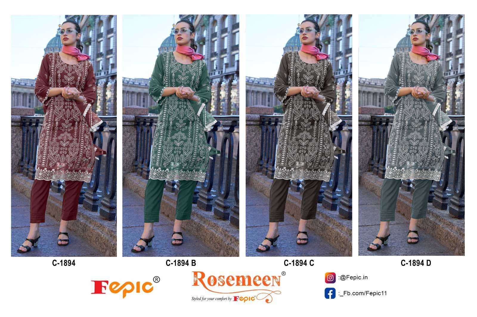 Buy Online D NO 1894 ROSEMEEN By FEPIC suit collection manufacturer Surat 4 Pcs of Full Catalogue at Wholesale Price. Looking for D NO 1894 ROSEMEEN By FEPIC suit collection manufacturer Surat Full Catalouge at Best Price? Buy Now D NO 1894 ROSEMEEN By FEPIC suit collection manufacturer Surat at Wholesale Rate of Rs 5036 with Total 4 Pcs from authroized dealer and supplier of FEPIC Brand. Cost of Each piece is just only Rs 1259 which is very low and affordable price to resale the product in your retail store ,This is Surat based Wholesale Supplier & Dealer of FEPIC Brand. Click on Brand name to Know more about FEPIC Brand's products.Call or Whatsapp on 9898838984 for booking or enquiry