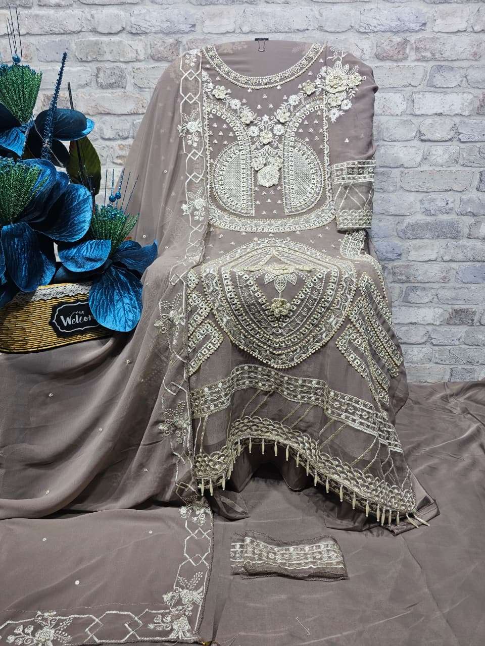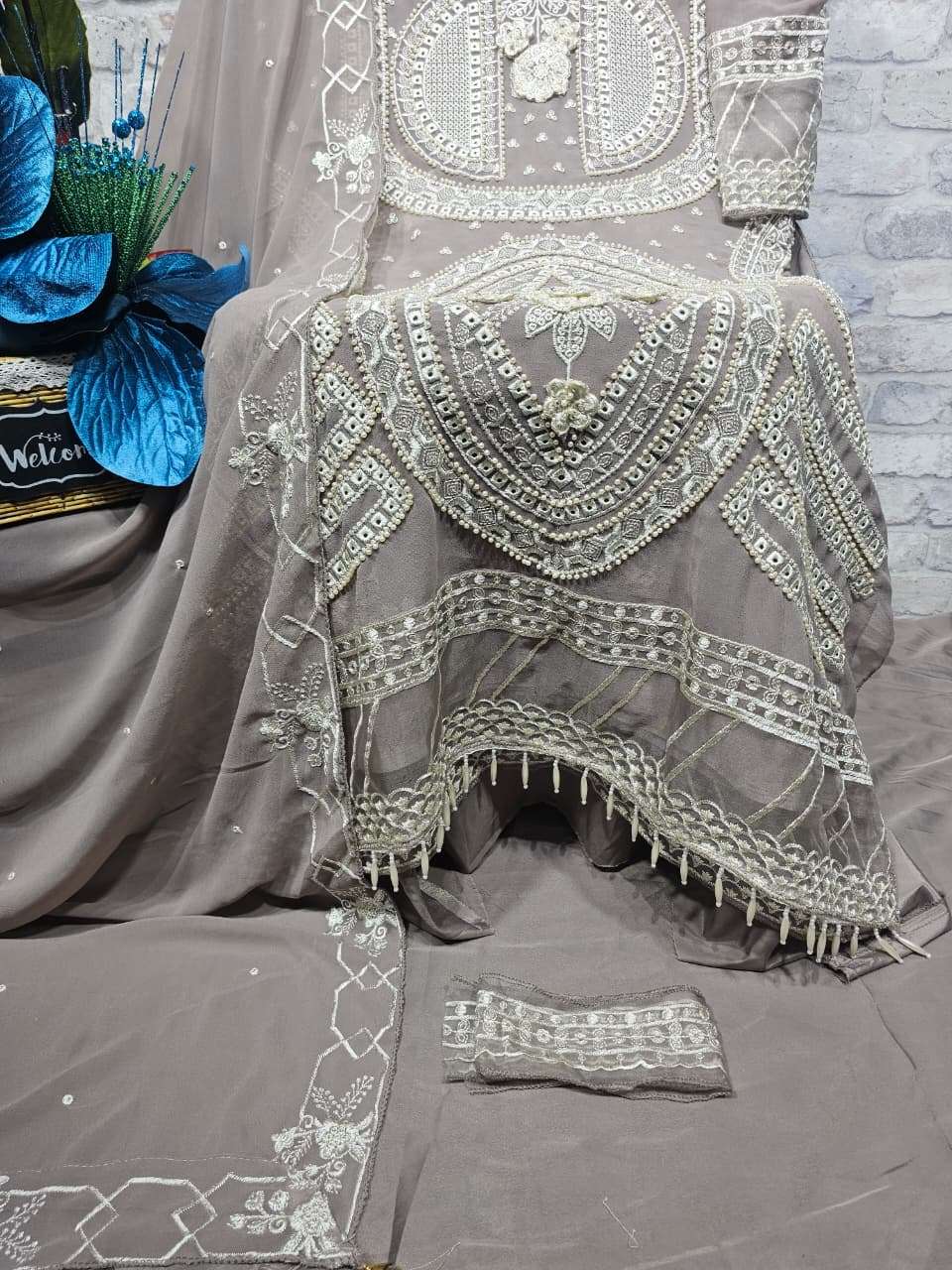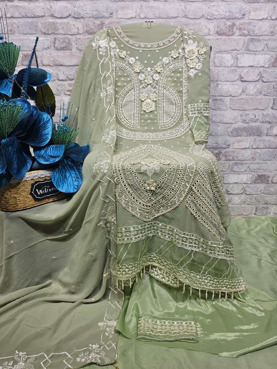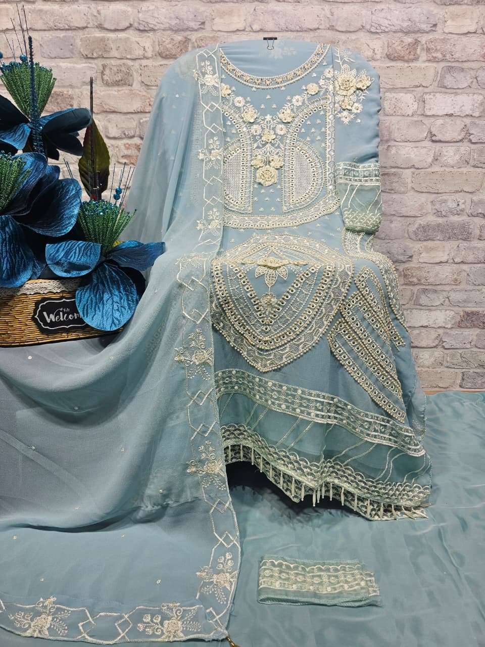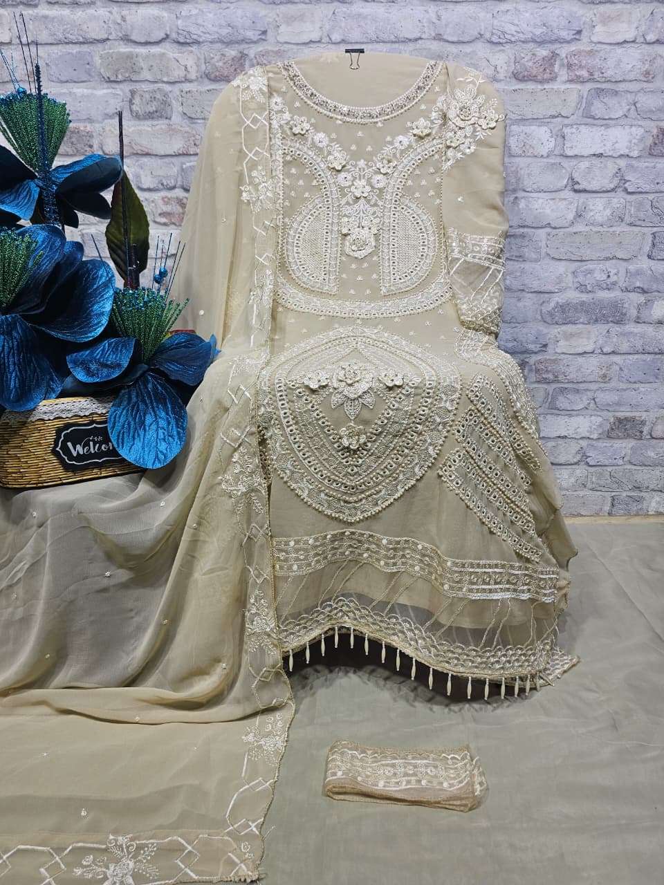 ━━━━━━━━━━━━━━━━━━ *💕💕 DESCRIPTION 💕💕* ━━━━━━━━━━━━━━━━━━ ✨ Designer stylish suit crafted in heavy Faux Georgette with elegant embroidery, pure handwork, appliqué work, and intricate cutwork. ✨ Beautiful and delicate daman with attached organza and tassel finishing for a premium look. ✨ Paired with a pure French crepe bottom featuring elegant patchwork. ✨ Faux Georgette dupatta with embroidery work and elegant two-side cutwork