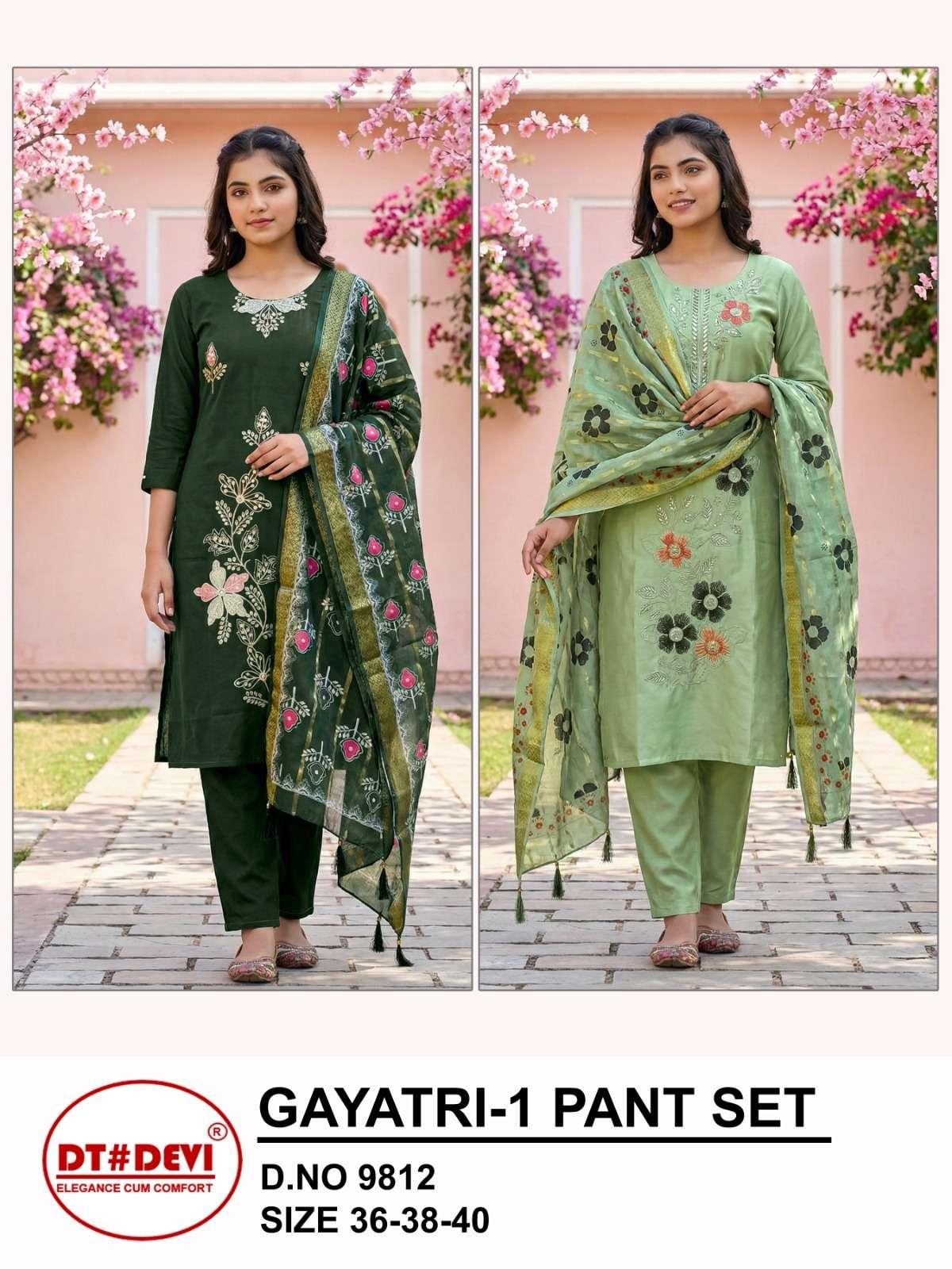 🍁 D.NO 9812 🍁GAYATRI-1 PANT SET 🍁SIZE - 36-38-40 🍁COLOURS - 2 🍁1 SET - 6 PCS 🍁FABRIC TOP & BOTTOM - ROMAN SILK 🍁RATE - 635/- 🍁DIGITAL ORGENZA DUPATTA