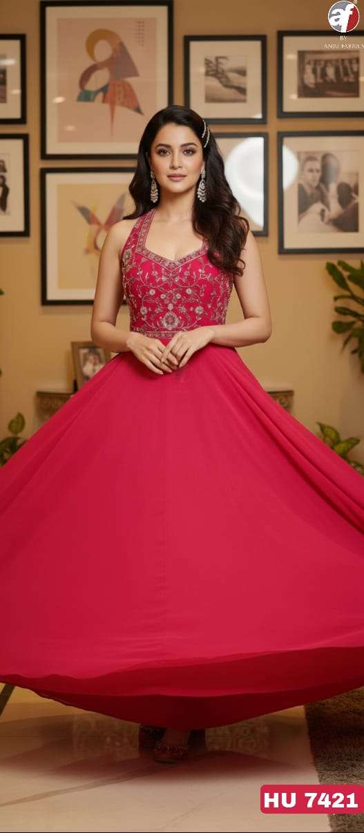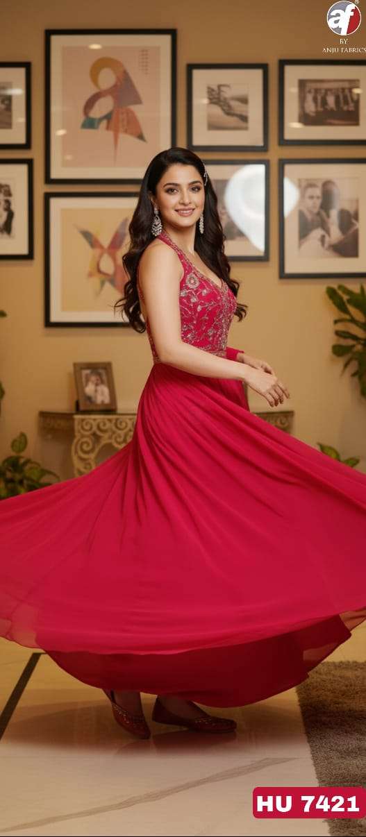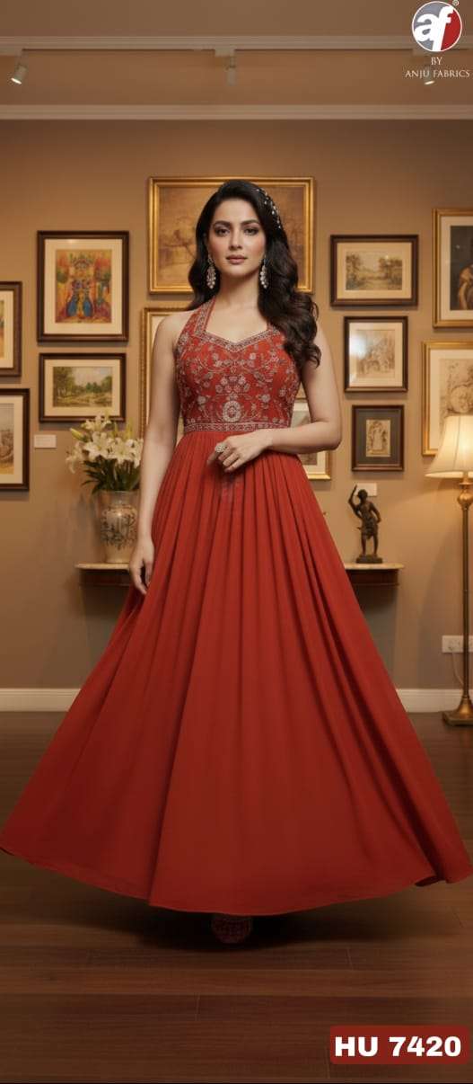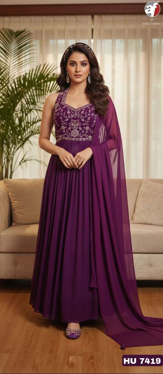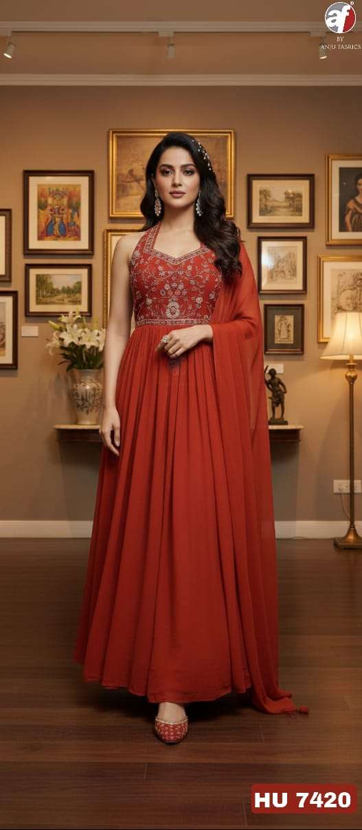 D NO HU 7419 by Anju fabric DESIGNER FLARED GOWN WITH DUPATTA collection manufacturers surat