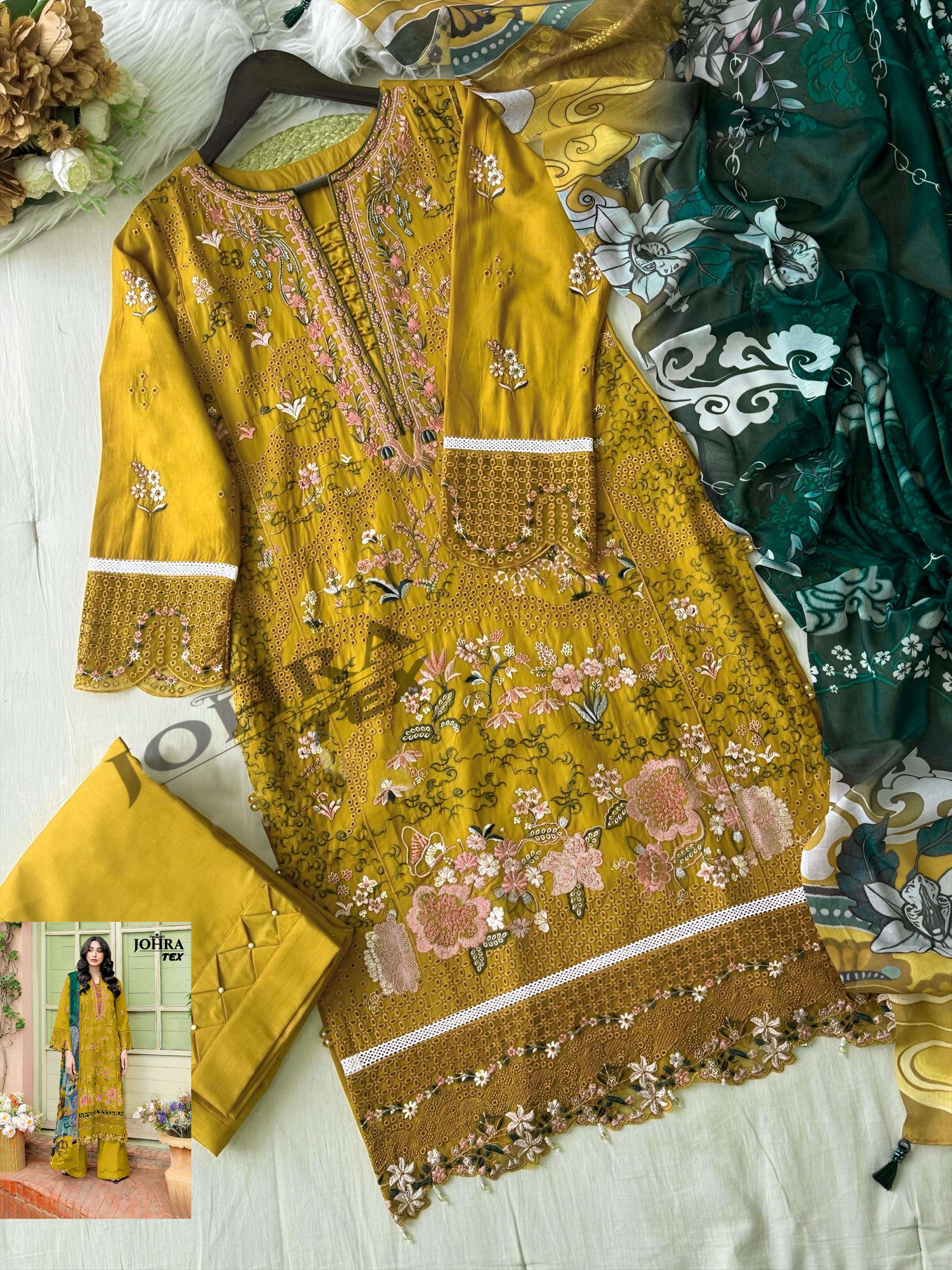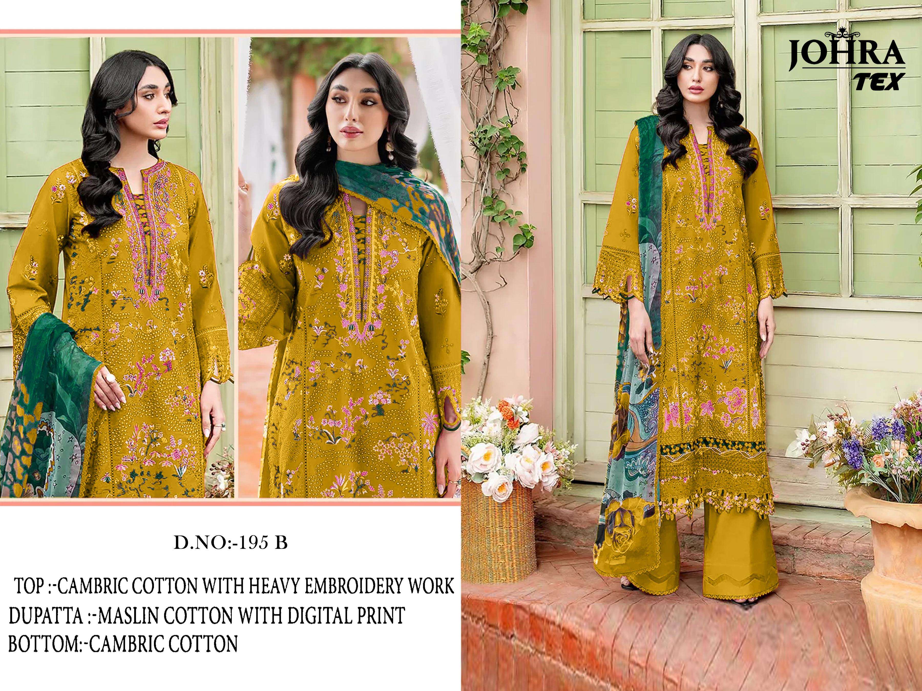 Buy Online D NO JT 195 B by JOHRA TEX suit collection manufacturers surat 1 Pcs of Full Catalogue at Wholesale Price. Looking for D NO JT 195 B by JOHRA TEX suit collection manufacturers surat Full Catalouge at Best Price? Buy Now D NO JT 195 B by JOHRA TEX suit collection manufacturers surat at Wholesale Rate of Rs 1050 with Total 1 Pcs from authroized dealer and supplier of BRAND'S Brand. Cost of Each piece is just only Rs 1050 which is very low and affordable price to resale the product in your retail store ,This is Surat based Wholesale Supplier & Dealer of BRAND'S Brand. Click on Brand name to Know more about BRAND'S Brand's products.Call or Whatsapp on 9898838984 for booking or enquiry