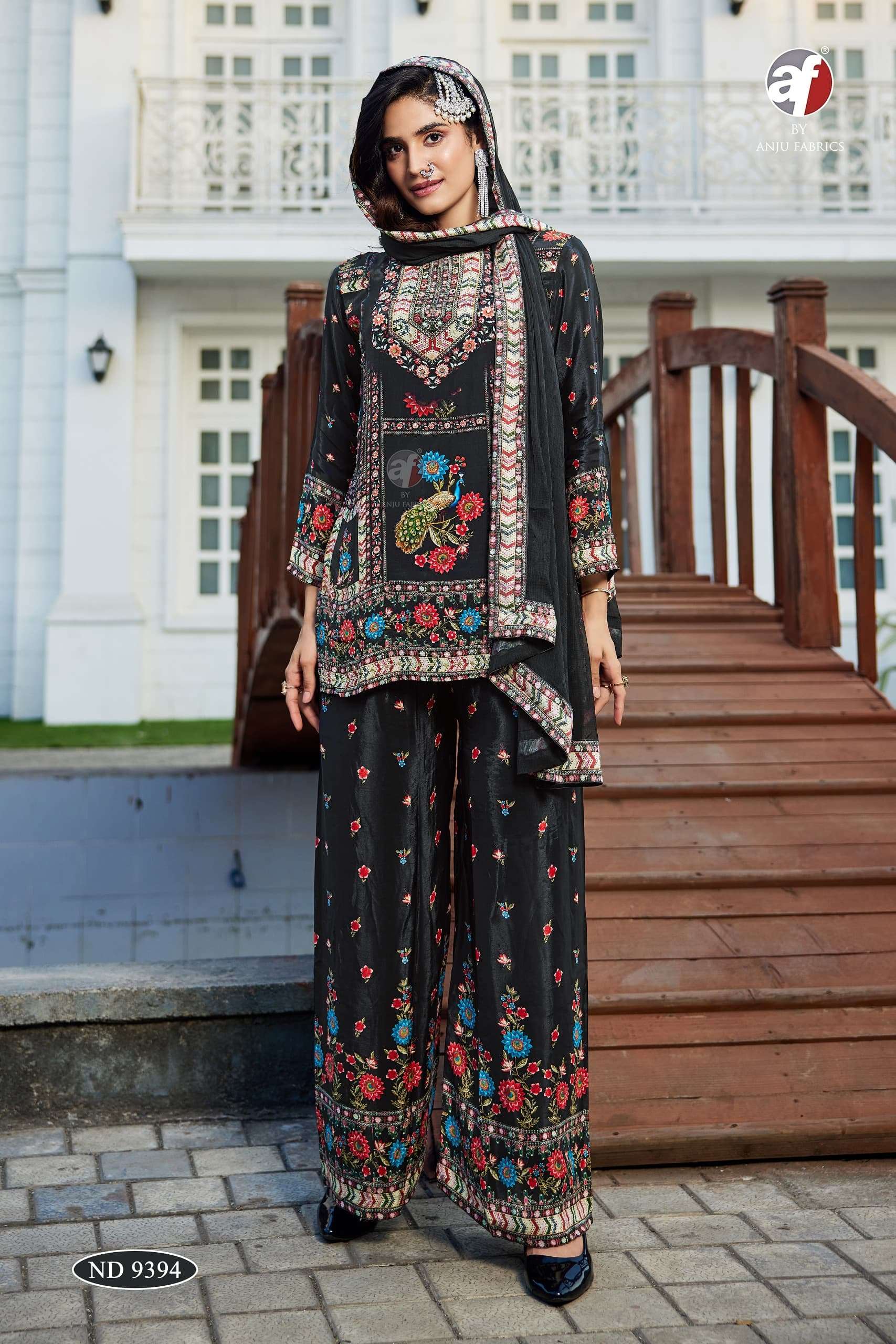D NO ND 9394 by anju fabric CREPE SHORT KURTI WITH PALAZZO DUPATTA collection manufacturer surat