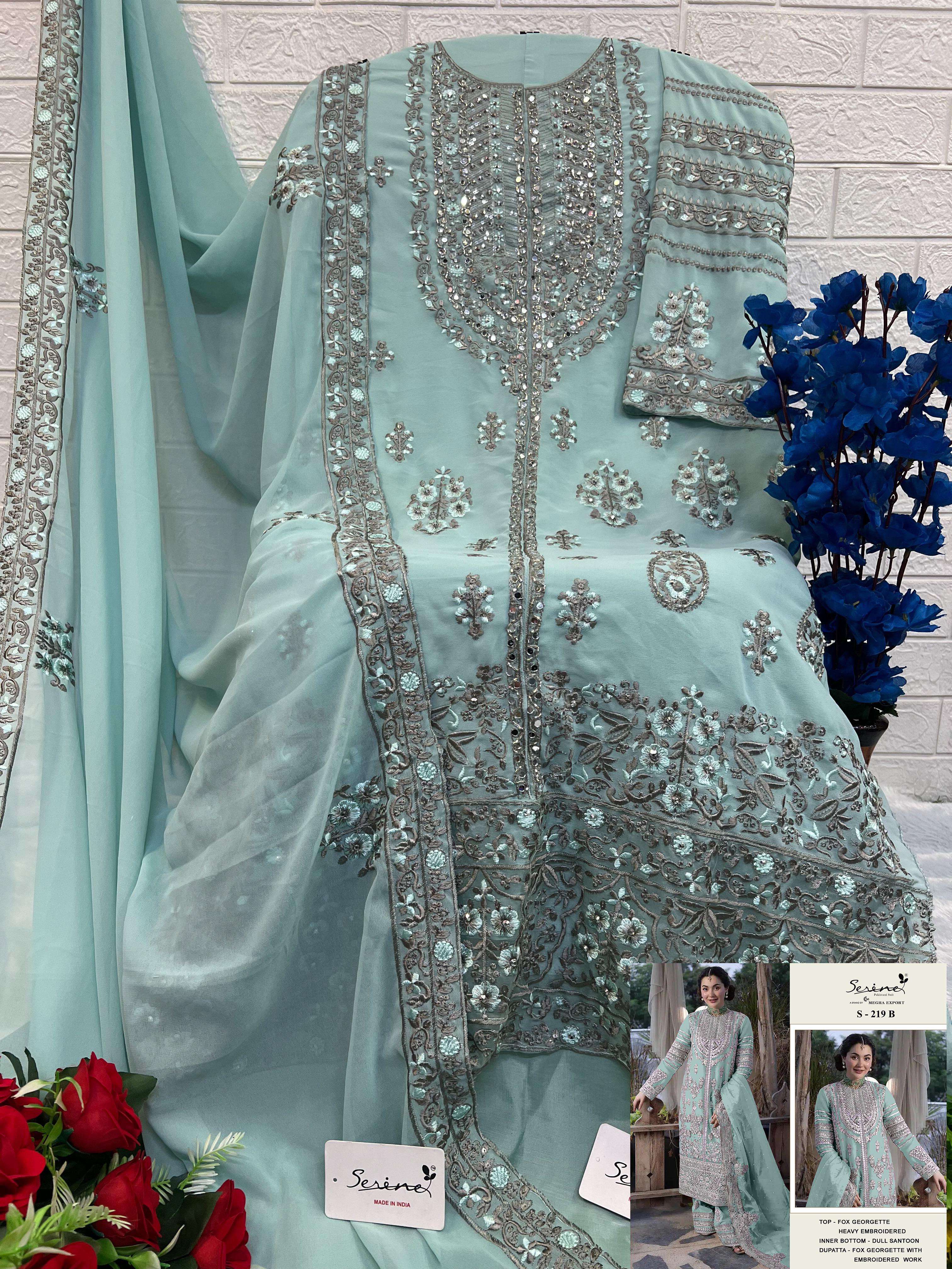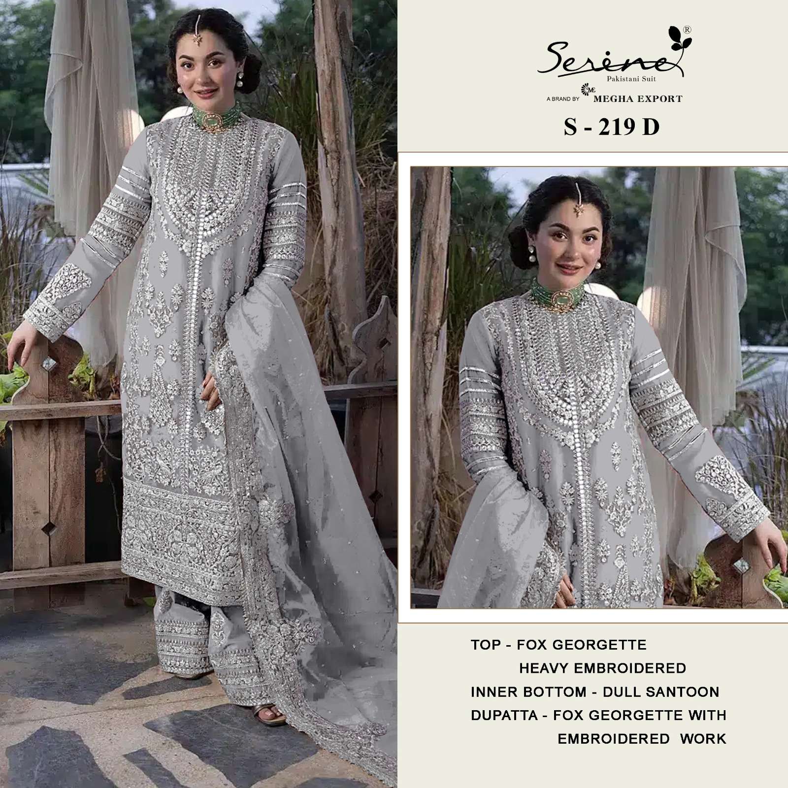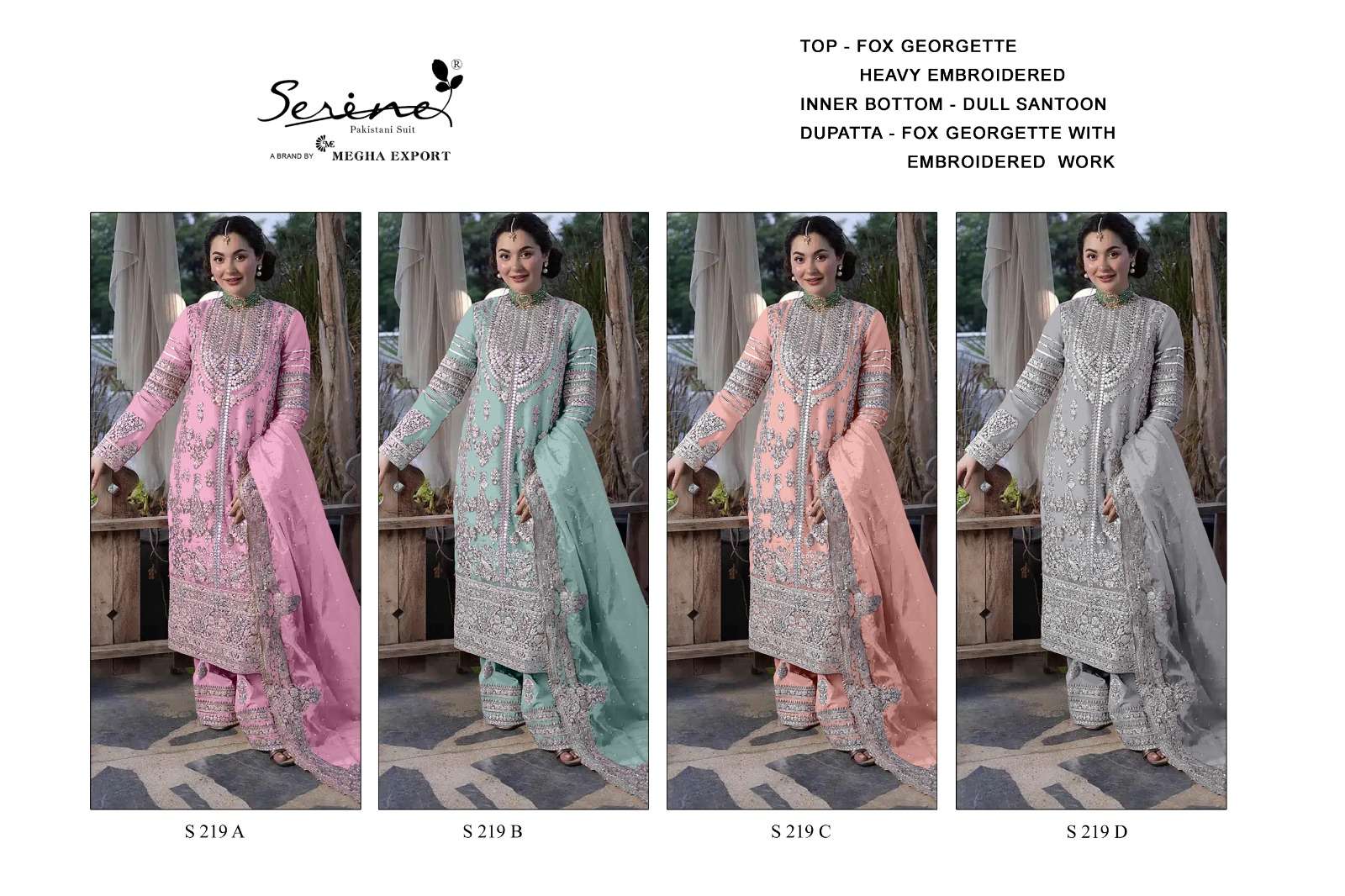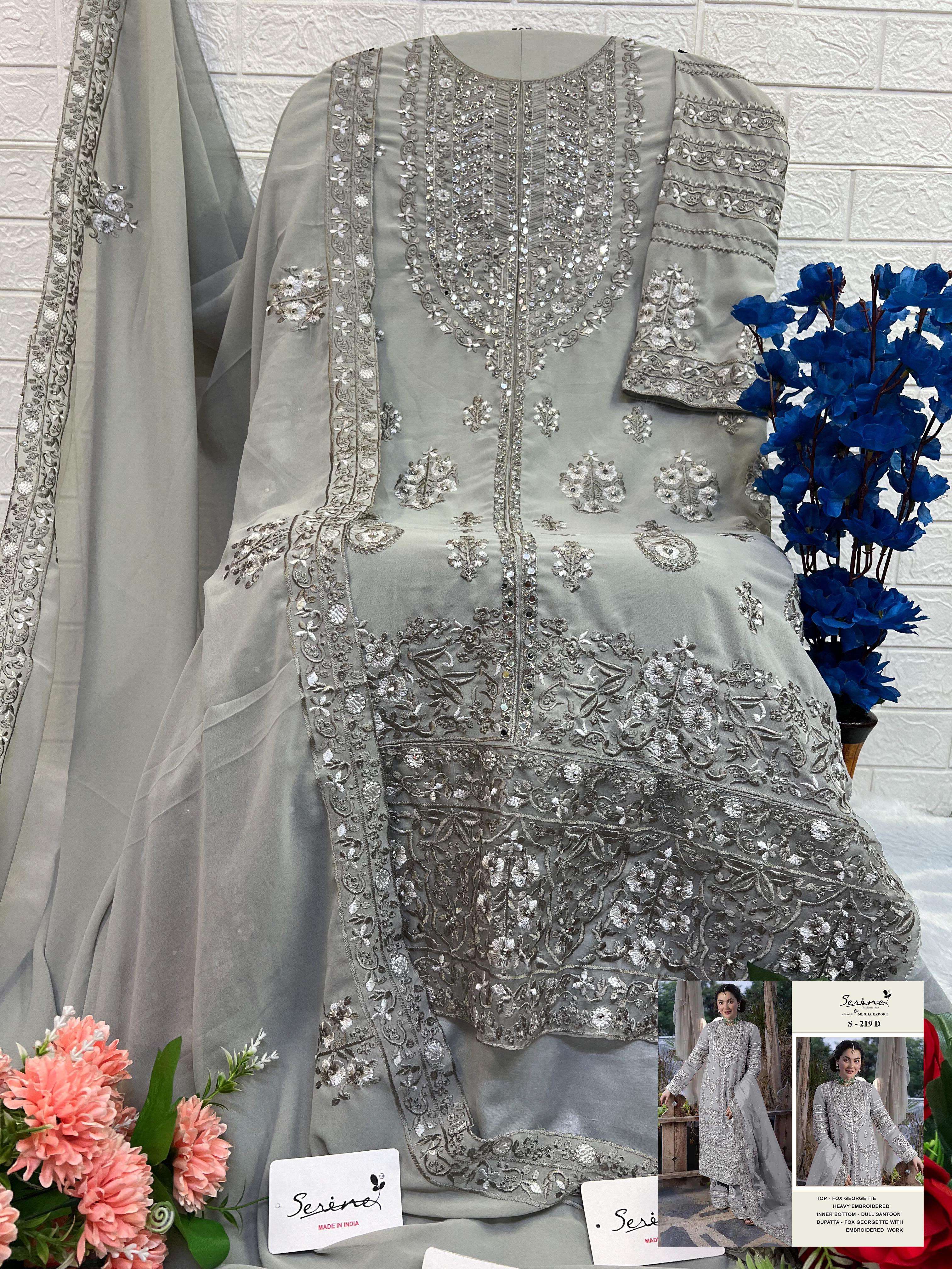 _*BRAND NAME*_:- SERINE®️ _*D NO*_:- S-219 A to D _*Top*_:- FOX GEORGETTE EMBROIDERED WITH HAND WORK _*Dupatta*_:- FOX HEAVY EMBROIDERED _*Bottom*_:- DULL SANTOON _*Inner*_:- DULL SANTOON _*RATE*_:-1299_ *4 pes in set* _**ready to ship