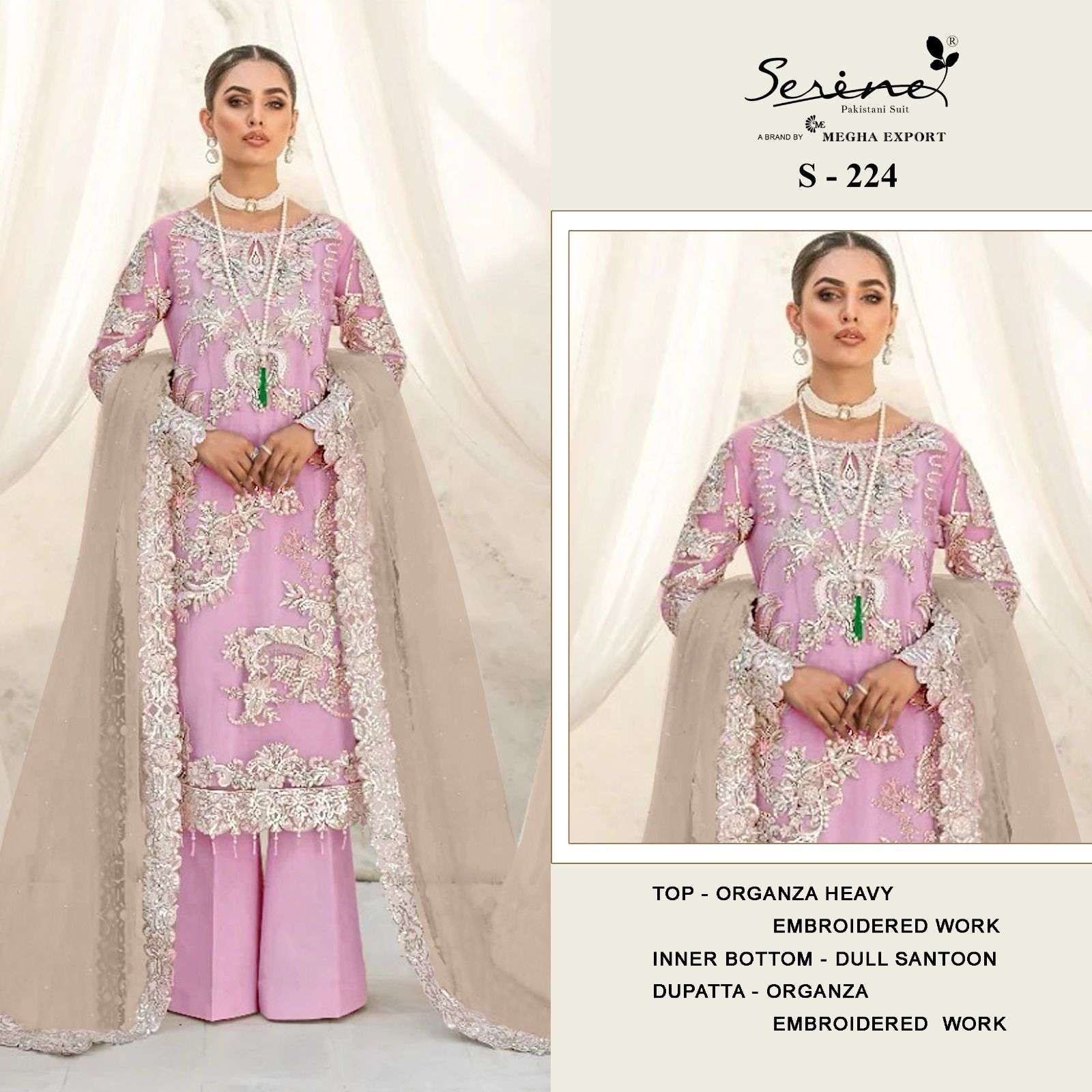 _*BRAND NAME*_:- SERINE®️ _*D NO*_:- S-224 A. _*Top*_:- ORGANZA HEAVY EMBROIDERED _*Dupatta*_:- ORGANZA HEAVY EMBROIDERED WITH LACE _*Bottom Innar**DULL SANTUN