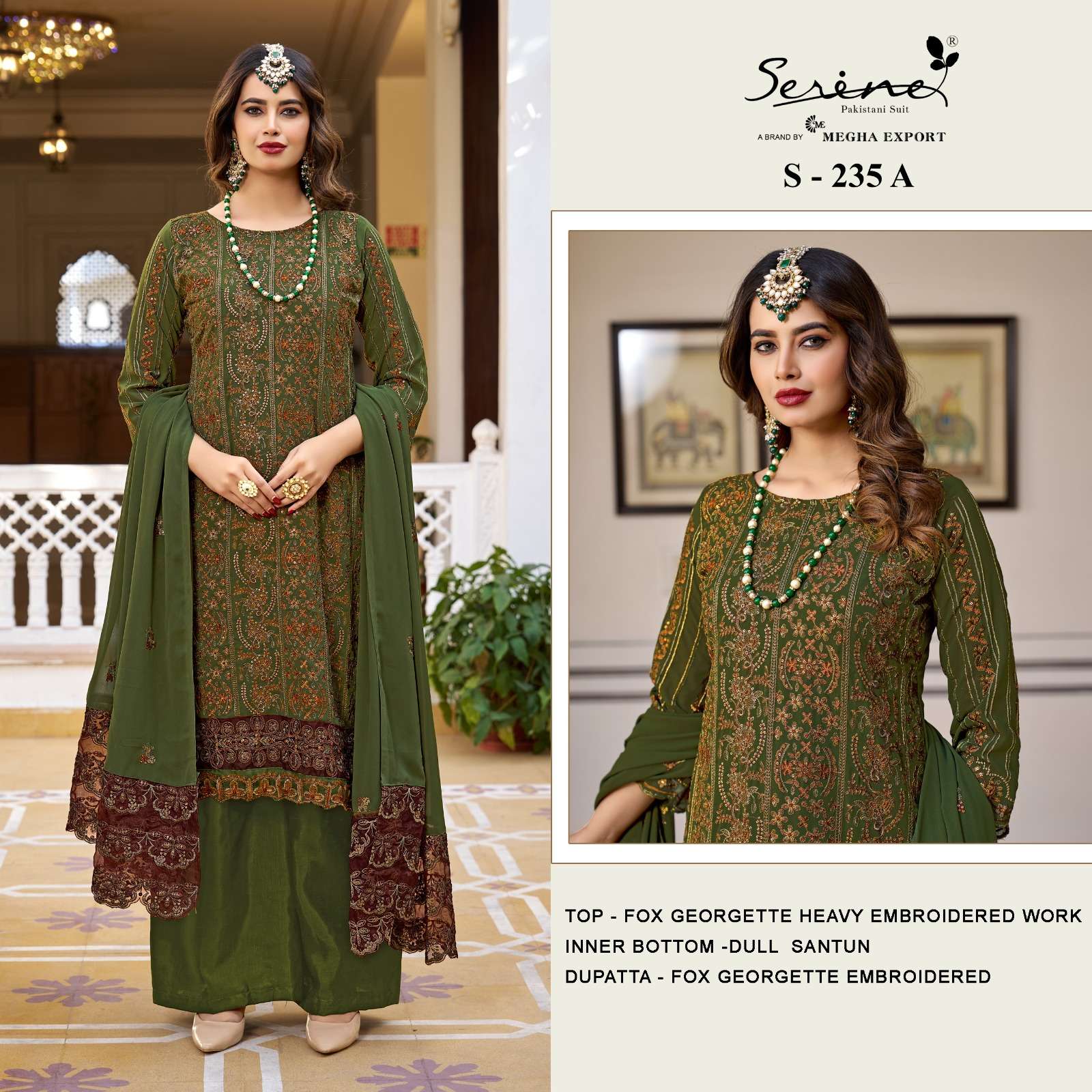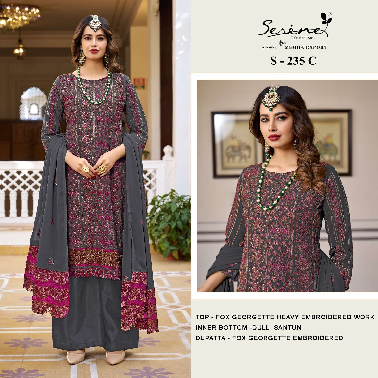 _*BRAND NAME*_:- SERINE®️ _*D NO*_:- S-235. _*Top*_:- FOX GEORGETTE HEAVY EMBROIDERED _*Dupatta*_:- FOX GEORGETTE.HEAVY EMBROIDERED WORK _*Bottom*_:- DULL SANTOON. _*Inner*_:- DULL SANTOON _*RATE*_:- 1399₹