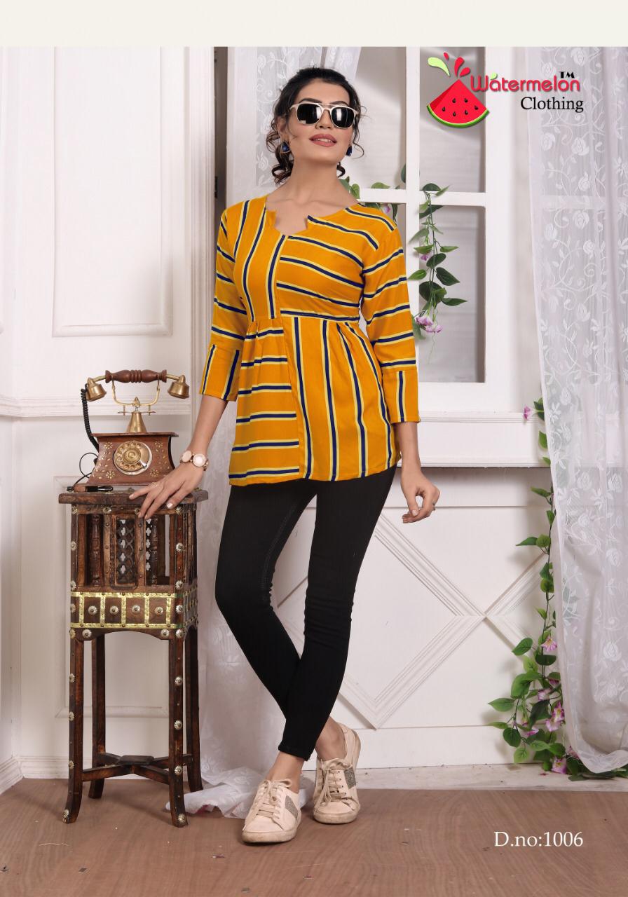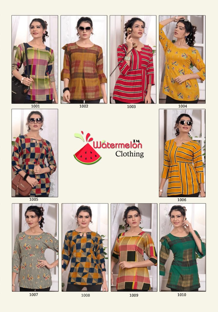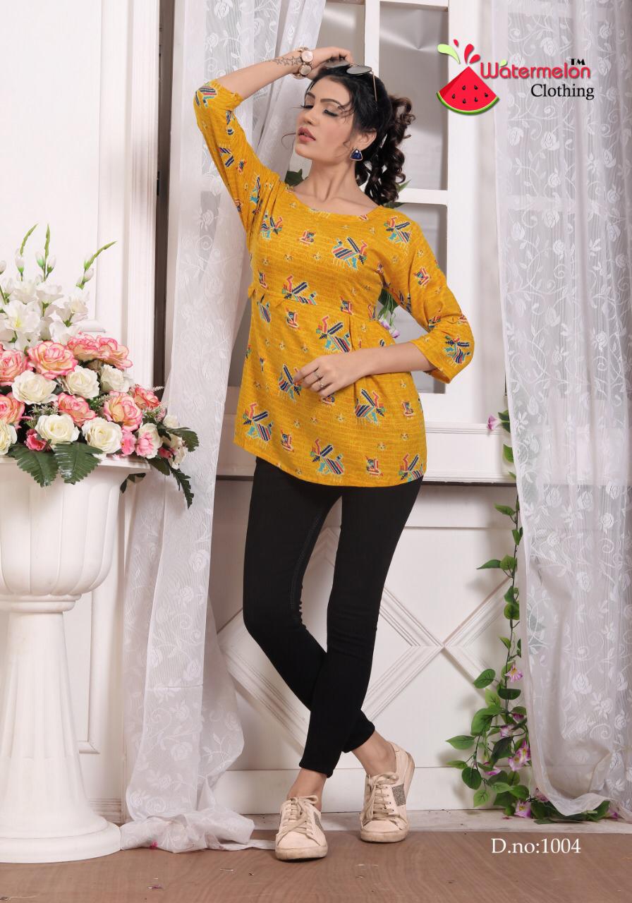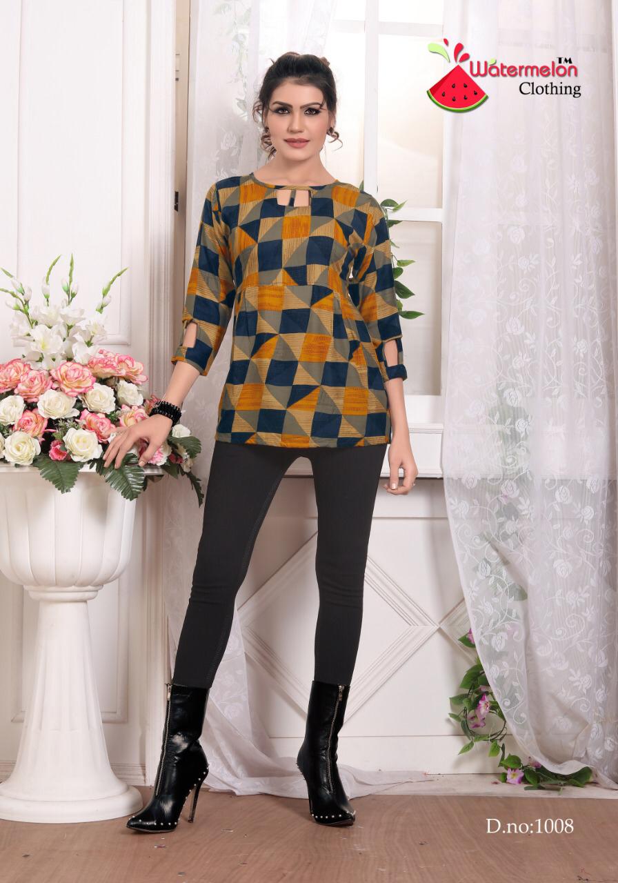 Buy Online Daimond Party 1 By Watermelon Reyon Printed Tops Wholesale Supplier Gujarat 10 Pcs of Full Catalogue at Wholesale Price. Looking for Daimond Party 1 By Watermelon Reyon Printed Tops Wholesale Supplier Gujarat Full Catalouge at Best Price? Buy Now Daimond Party 1 By Watermelon Reyon Printed Tops Wholesale Supplier Gujarat at Wholesale Rate of Rs 3300 with Total 10 Pcs from authroized dealer and supplier of WATERMELON Brand. Cost of Each piece is just only Rs 330 which is very low and affordable price to resale the product in your retail store ,This is Surat based Wholesale Supplier & Dealer of WATERMELON Brand. Click on Brand name to Know more about WATERMELON Brand's products.Call or Whatsapp on 9898838984 for booking or enquiry