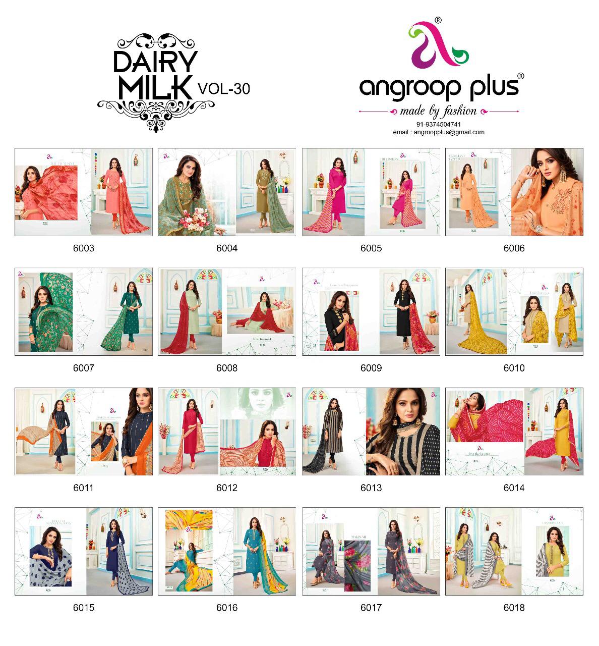 Buy Online Dairy Milk Vol 30 Designer Dress Materials Wholesale Supplier Surat 16 Pcs of Full Catalogue at Wholesale Price. Looking for Dairy Milk Vol 30 Designer Dress Materials Wholesale Supplier Surat Full Catalouge at Best Price? Buy Now Dairy Milk Vol 30 Designer Dress Materials Wholesale Supplier Surat at Wholesale Rate of Rs 7600 with Total 16 Pcs from authroized dealer and supplier of ANGROOP PLUS Brand. Cost of Each piece is just only Rs 475 which is very low and affordable price to resale the product in your retail store ,This is Surat based Wholesale Supplier & Dealer of ANGROOP PLUS Brand. Click on Brand name to Know more about ANGROOP PLUS Brand's products.Call or Whatsapp on 9898838984 for booking or enquiry
