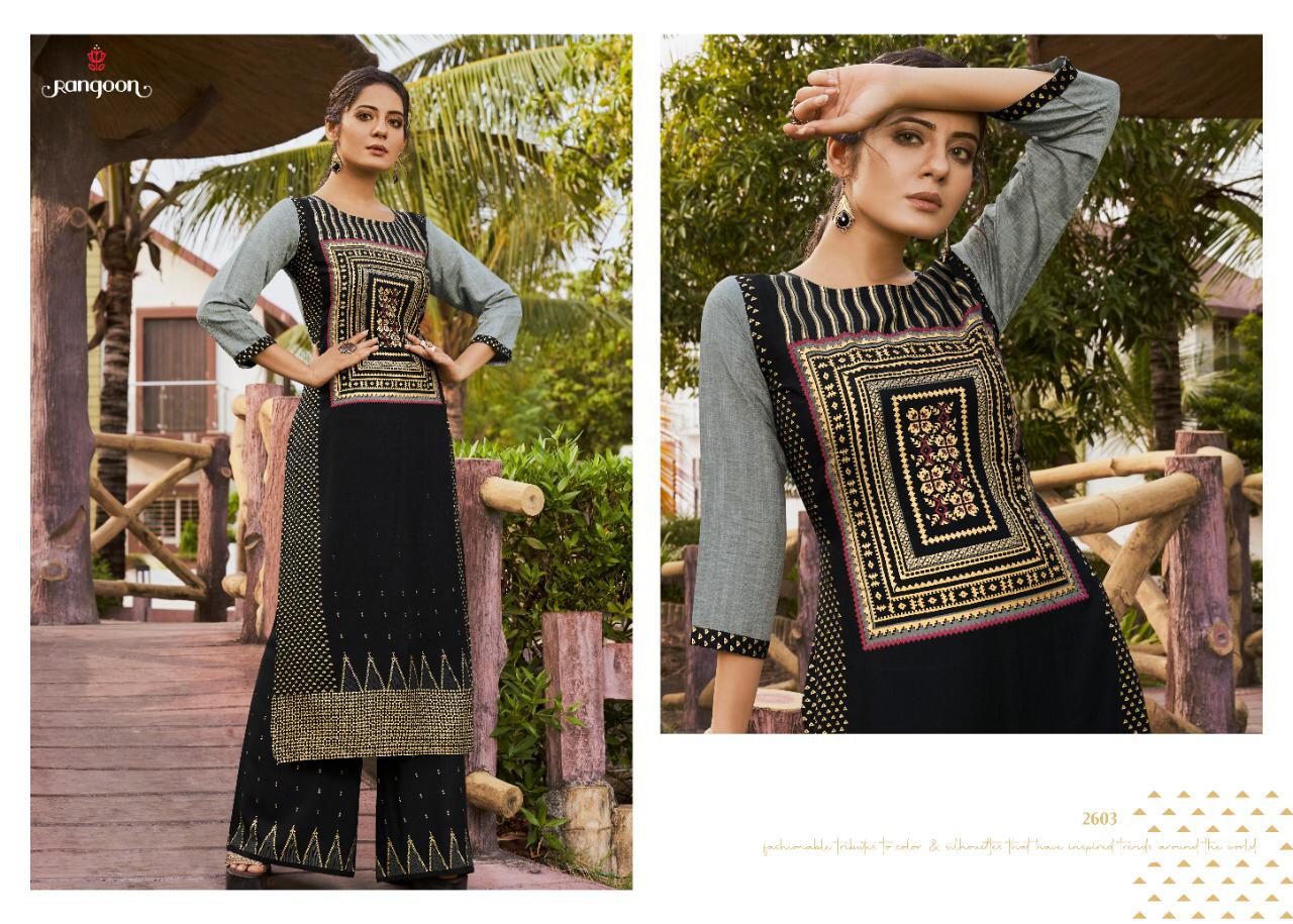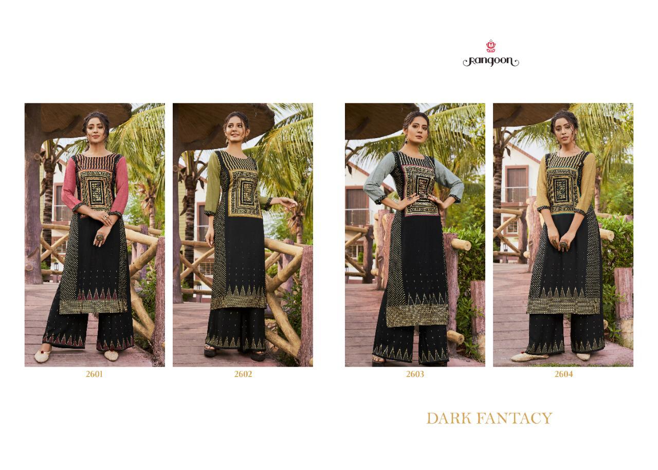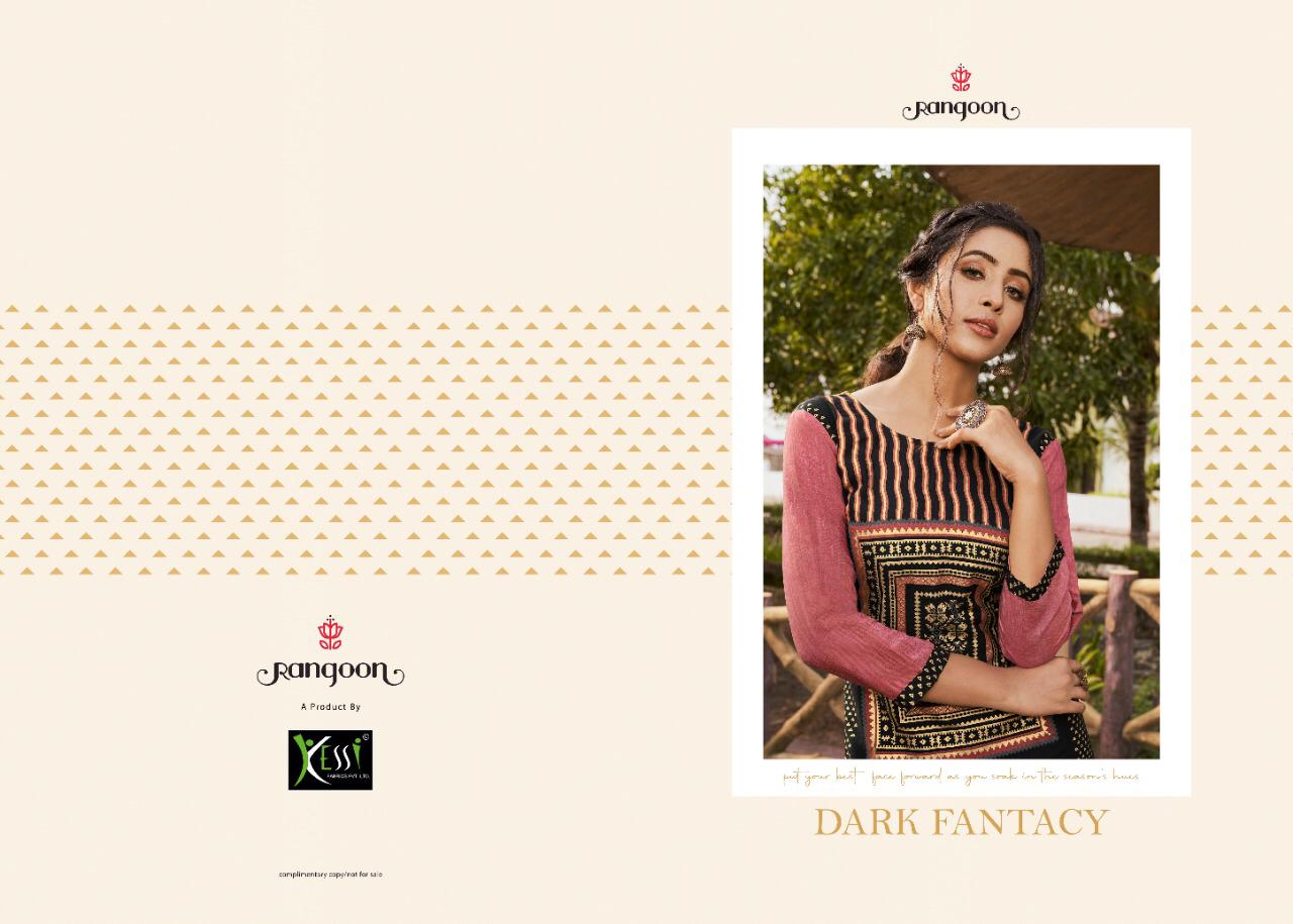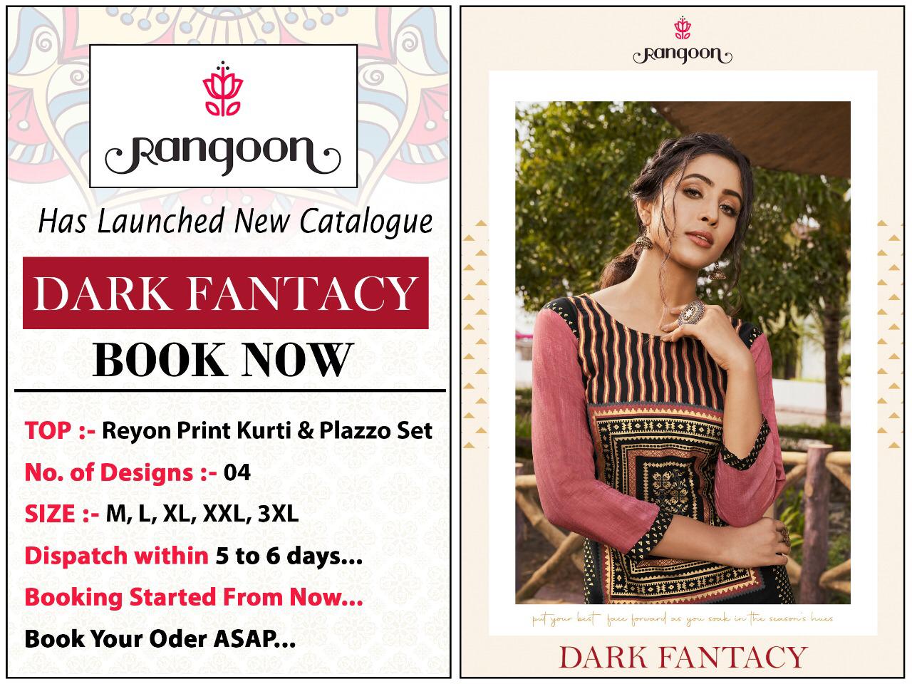 Buy Online Dark Fantasy By Rangoon Kurtis With Bottom Wholesale Supplier And Dealer Surat 4 Pcs of Full Catalogue at Wholesale Price. Looking for Dark Fantasy By Rangoon Kurtis With Bottom Wholesale Supplier And Dealer Surat Full Catalouge at Best Price? Buy Now Dark Fantasy By Rangoon Kurtis With Bottom Wholesale Supplier And Dealer Surat at Wholesale Rate of Rs 2396 with Total 4 Pcs from authroized dealer and supplier of RANGOON Brand. Cost of Each piece is just only Rs 599 which is very low and affordable price to resale the product in your retail store ,This is Surat based Wholesale Supplier & Dealer of RANGOON Brand. Click on Brand name to Know more about RANGOON Brand's products.Call or Whatsapp on 9898838984 for booking or enquiry