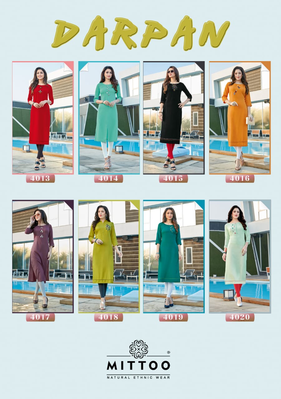 Buy Online Darpan By Mittoo Heavy Reyon Kurtis Wholesale Supplier Gujarat 8 Pcs of Full Catalogue at Wholesale Price. Looking for Darpan By Mittoo Heavy Reyon Kurtis Wholesale Supplier Gujarat Full Catalouge at Best Price? Buy Now Darpan By Mittoo Heavy Reyon Kurtis Wholesale Supplier Gujarat at Wholesale Rate of Rs 3560 with Total 8 Pcs from authroized dealer and supplier of MITTOO Brand. Cost of Each piece is just only Rs 445 which is very low and affordable price to resale the product in your retail store ,This is Surat based Wholesale Supplier & Dealer of MITTOO Brand. Click on Brand name to Know more about MITTOO Brand's products.Call or Whatsapp on 9898838984 for booking or enquiry