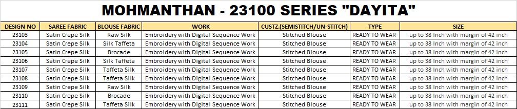 ? *? OUR DESIGNER READY TO WEAR SAREE COLLECTION ??* ? *BRAND NAME : MAHOTSAV* *CATALOG : "MOHMANTHAN 23100 DAYITA* *PRICE :-* * *23103-2095/-* *23104-2095/-* *23105-2415/-* *23106-2095/-* *23107-3425/-* *23108-3535/-* *23109-3075/-* *23110-2095/-* *23111-3435/-* *+ 5% GST EXTRA* *FABRIC -: ATTACHED* *BLOUSE TYPE : STITCHED BLOUSE* *BLOUSE SIZE : *up to 38 Inch with margin of 42 inch* *SINGLES AVAILABLE* *NOTE : There might be slight color variation due to lightings & flash while photo shoot.* 100+ single |