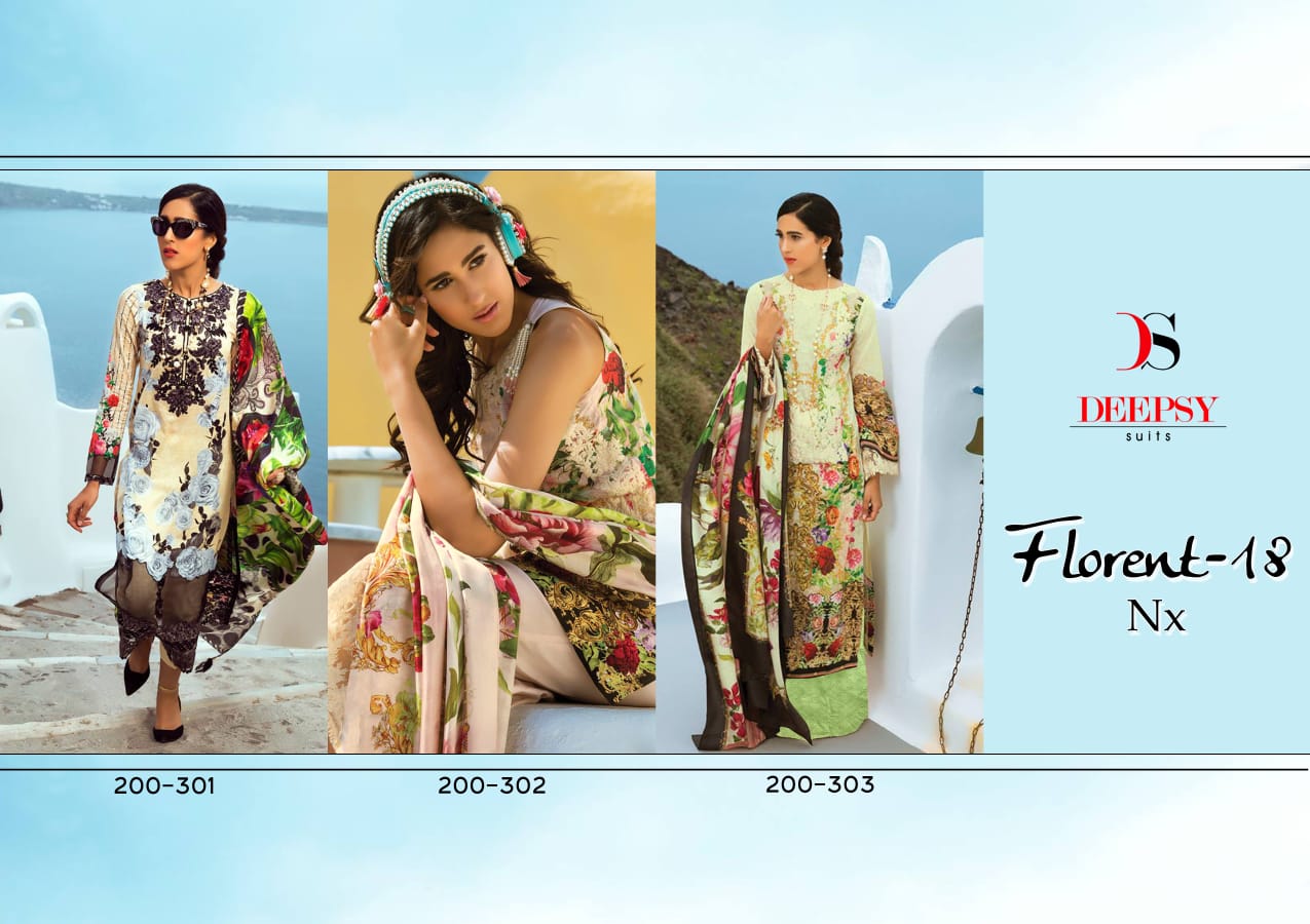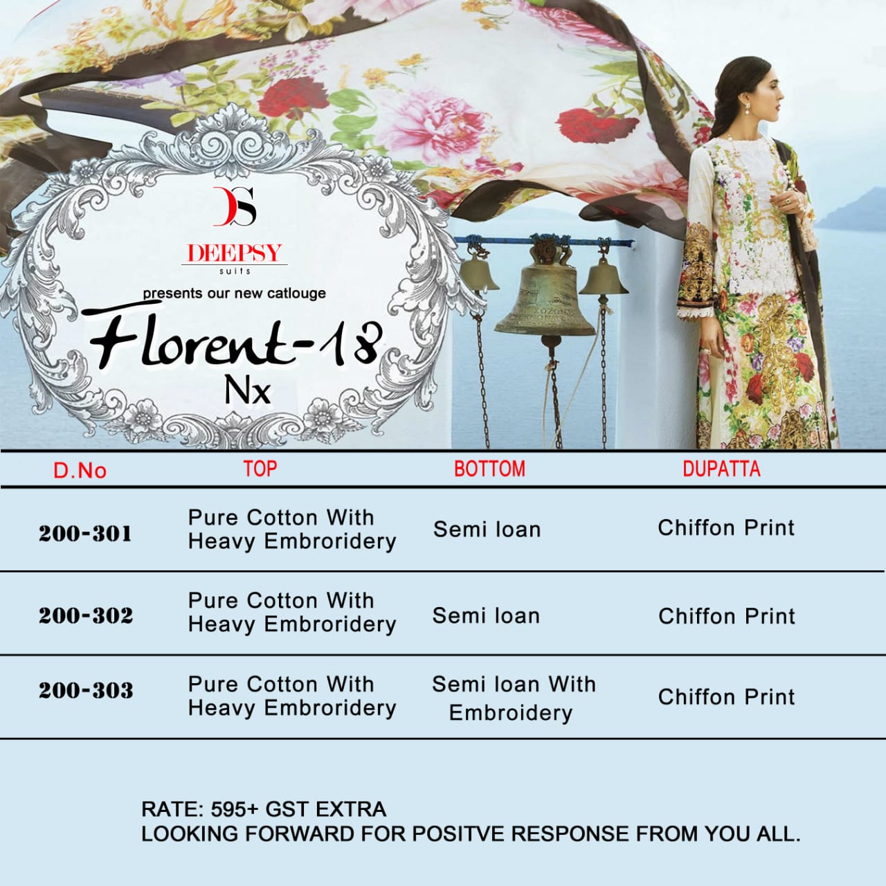 Buy Online Deepsy Florent 18 Nx 200301 Series Pure Cotton Salwar Kameez Catlog Wholesale Dealer Surat 3 Pcs of Full Catalogue at Wholesale Price. Looking for Deepsy Florent 18 Nx 200301 Series Pure Cotton Salwar Kameez Catlog Wholesale Dealer Surat Full Catalouge at Best Price? Buy Now Deepsy Florent 18 Nx 200301 Series Pure Cotton Salwar Kameez Catlog Wholesale Dealer Surat at Wholesale Rate of Rs 1785 with Total 3 Pcs from authroized dealer and supplier of DEEPSY Brand. Cost of Each piece is just only Rs 595 which is very low and affordable price to resale the product in your retail store ,This is Surat based Wholesale Supplier & Dealer of DEEPSY Brand. Click on Brand name to Know more about DEEPSY Brand's products.Call or Whatsapp on 9898838984 for booking or enquiry
