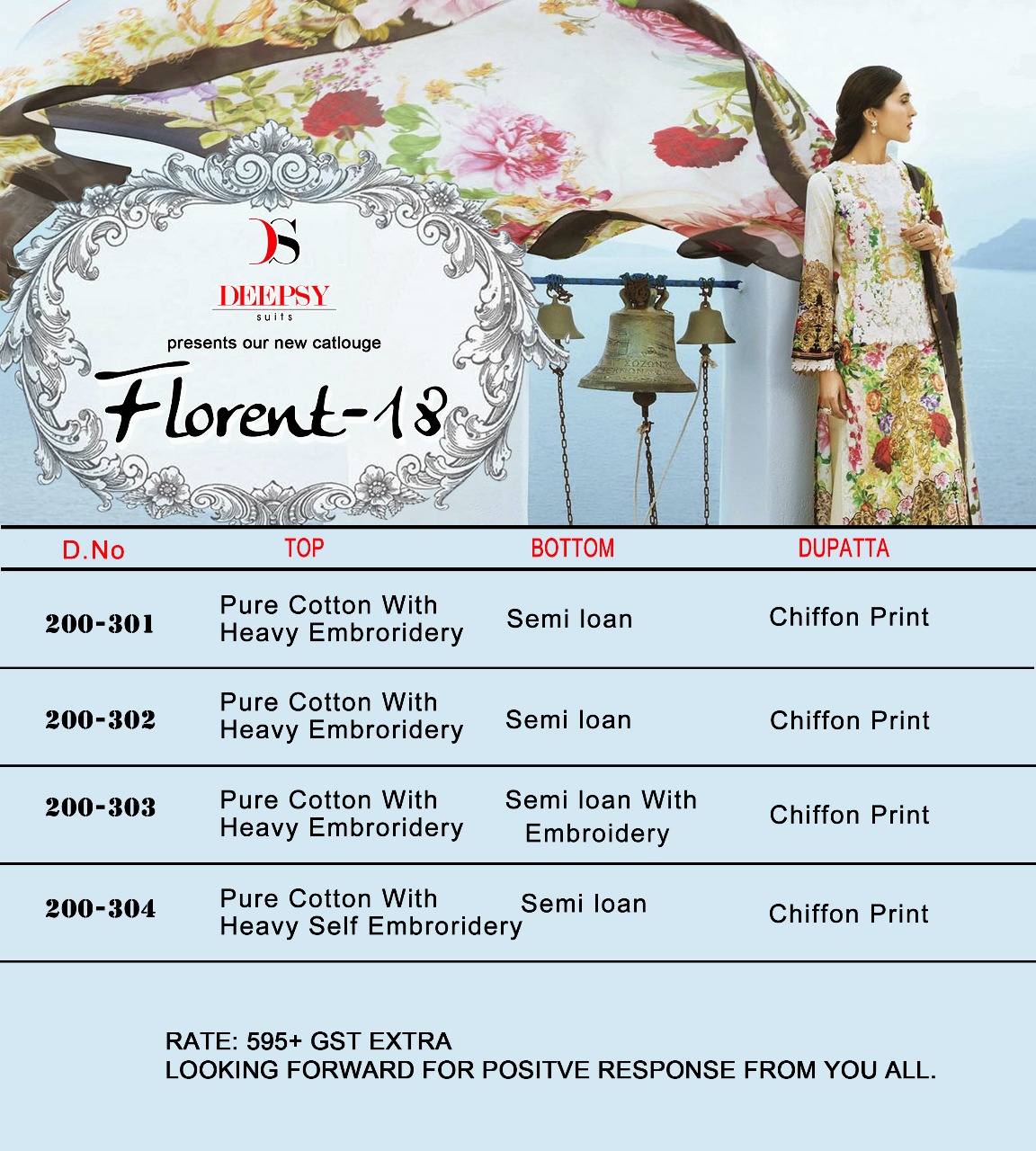 Deepsy florent 18 series 200301 to 200304 cotton embroidered Pakistani salwaar suits wholesale price at nityanx Fabric details and price given in image Book your order fast order and inquiry +919898838984 |