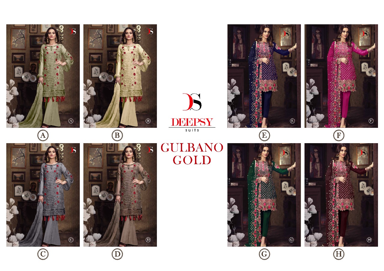 Buy Online Deepsy Gulbano Gold New Colours Georgette Pakistani Suits 8 Pcs of Full Catalogue at Wholesale Price. Looking for Deepsy Gulbano Gold New Colours Georgette Pakistani Suits Full Catalouge at Best Price? Buy Now Deepsy Gulbano Gold New Colours Georgette Pakistani Suits at Wholesale Rate of Rs 9592 with Total 8 Pcs from authroized dealer and supplier of DEEPSY Brand. Cost of Each piece is just only Rs 1199 which is very low and affordable price to resale the product in your retail store ,This is Surat based Wholesale Supplier & Dealer of DEEPSY Brand. Click on Brand name to Know more about DEEPSY Brand's products.Call or Whatsapp on 9898838984 for booking or enquiry