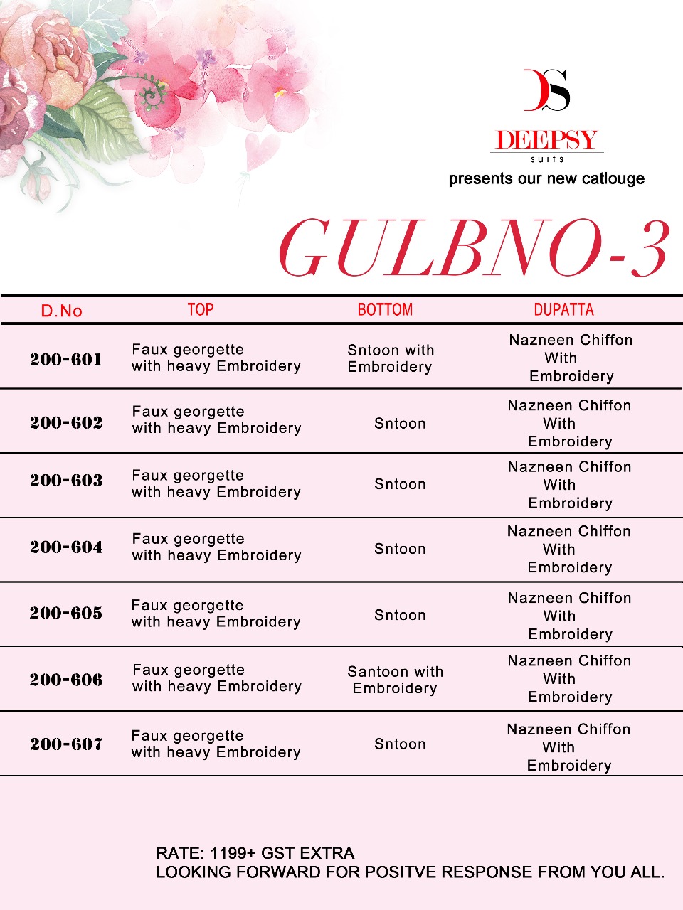 Buy Online Deepsy Gulbno Vol 3 200601 Series Georgette Pakistani Suit Catlog Wholesaler And Supplier Surat 7 Pcs of Full Catalogue at Wholesale Price. Looking for Deepsy Gulbno Vol 3 200601 Series Georgette Pakistani Suit Catlog Wholesaler And Supplier Surat Full Catalouge at Best Price? Buy Now Deepsy Gulbno Vol 3 200601 Series Georgette Pakistani Suit Catlog Wholesaler And Supplier Surat at Wholesale Rate of Rs 8393 with Total 7 Pcs from authroized dealer and supplier of DEEPSY Brand. Cost of Each piece is just only Rs 1199 which is very low and affordable price to resale the product in your retail store ,This is Surat based Wholesale Supplier & Dealer of DEEPSY Brand. Click on Brand name to Know more about DEEPSY Brand's products.Call or Whatsapp on 9898838984 for booking or enquiry