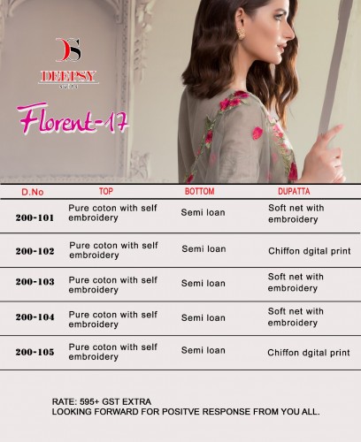 Buy Online Deepsy Presents Florent 17 Cotton Salwar Suits Wholesale Supplier And Dealer India 5 Pcs of Full Catalogue at Wholesale Price. Looking for Deepsy Presents Florent 17 Cotton Salwar Suits Wholesale Supplier And Dealer India Full Catalouge at Best Price? Buy Now Deepsy Presents Florent 17 Cotton Salwar Suits Wholesale Supplier And Dealer India at Wholesale Rate of Rs 2975 with Total 5 Pcs from authroized dealer and supplier of DEEPSY Brand. Cost of Each piece is just only Rs 595 which is very low and affordable price to resale the product in your retail store ,This is Surat based Wholesale Supplier & Dealer of DEEPSY Brand. Click on Brand name to Know more about DEEPSY Brand's products.Call or Whatsapp on 9898838984 for booking or enquiry