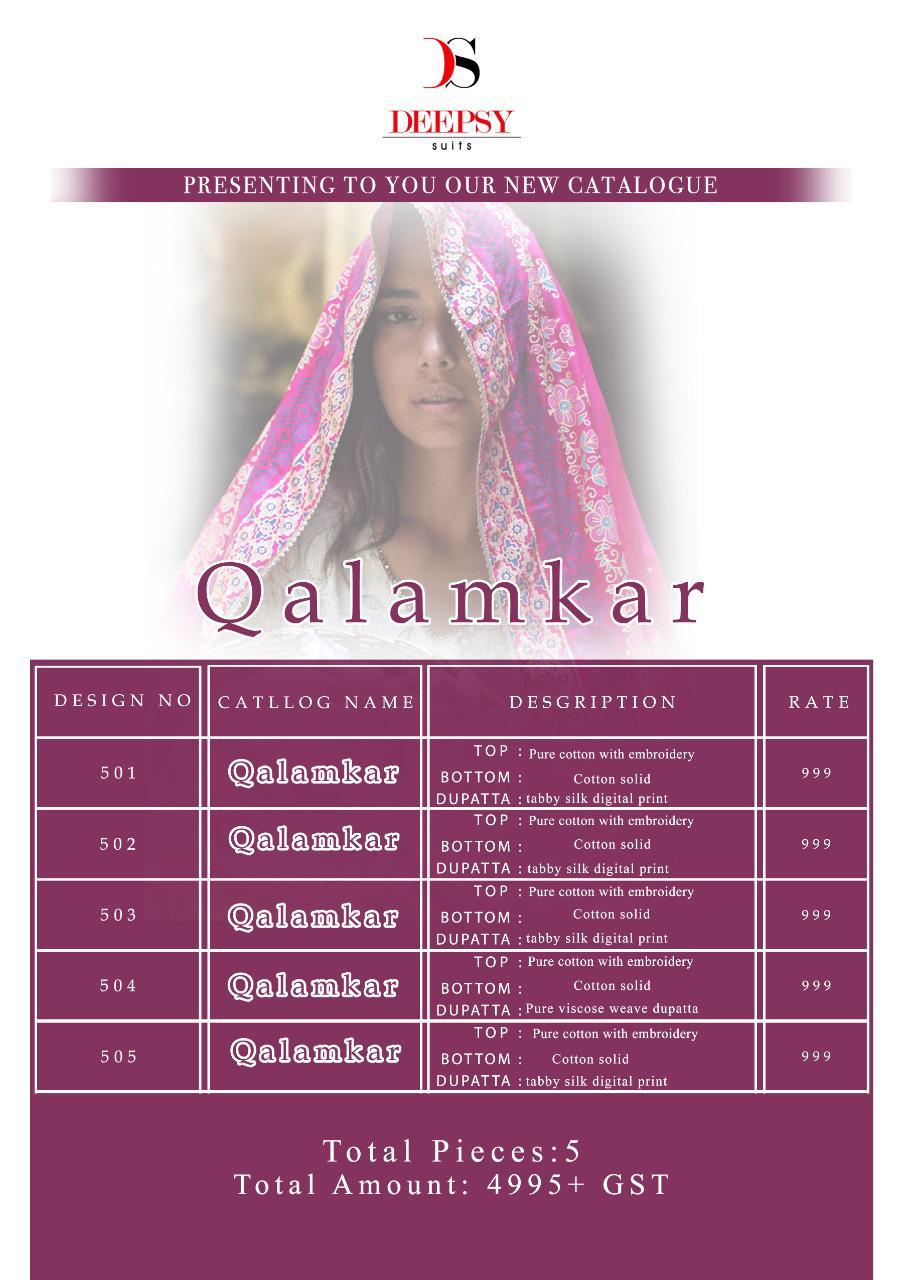 Buy Online Deepsy Qalamkar Series 501 Pakistani Suits Wholesale Supplier Gujarat 5 Pcs of Full Catalogue at Wholesale Price. Looking for Deepsy Qalamkar Series 501 Pakistani Suits Wholesale Supplier Gujarat Full Catalouge at Best Price? Buy Now Deepsy Qalamkar Series 501 Pakistani Suits Wholesale Supplier Gujarat at Wholesale Rate of Rs 4995 with Total 5 Pcs from authroized dealer and supplier of DEEPSY Brand. Cost of Each piece is just only Rs 999 which is very low and affordable price to resale the product in your retail store ,This is Surat based Wholesale Supplier & Dealer of DEEPSY Brand. Click on Brand name to Know more about DEEPSY Brand's products.Call or Whatsapp on 9898838984 for booking or enquiry
