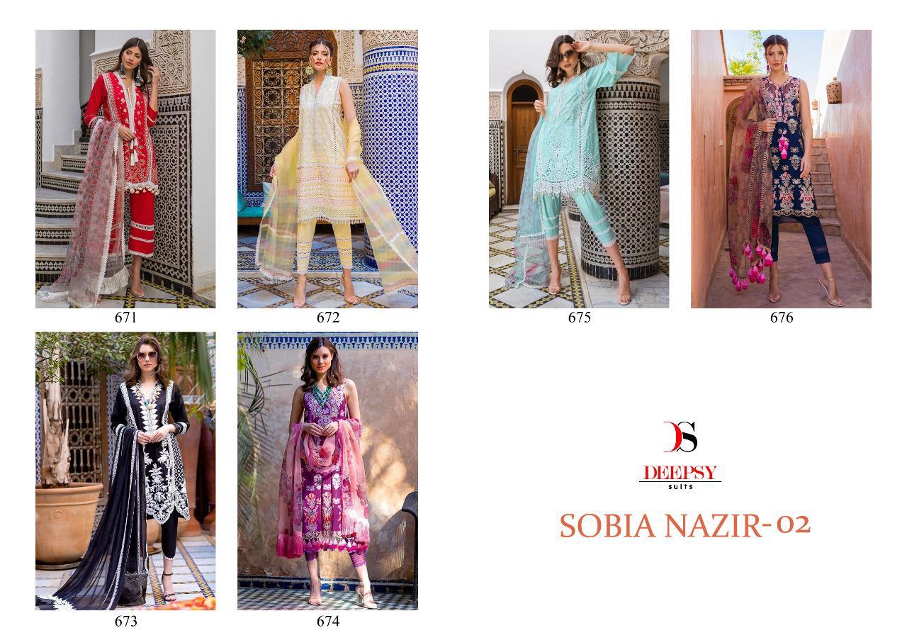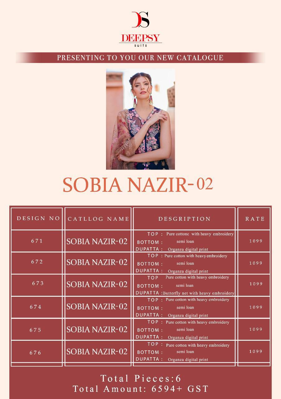Buy Online Deepsy Sobia Nazir 02 Series 671 Designer Party Wear Suits Wholesale Supplier Gujarat 6 Pcs of Full Catalogue at Wholesale Price. Looking for Deepsy Sobia Nazir 02 Series 671 Designer Party Wear Suits Wholesale Supplier Gujarat Full Catalouge at Best Price? Buy Now Deepsy Sobia Nazir 02 Series 671 Designer Party Wear Suits Wholesale Supplier Gujarat at Wholesale Rate of Rs 6594 with Total 6 Pcs from authroized dealer and supplier of Brand. Cost of Each piece is just only Rs 1099 which is very low and affordable price to resale the product in your retail store ,This is Surat based Wholesale Supplier & Dealer of Brand. Click on Brand name to Know more about Brand's products.Call or Whatsapp on 9898838984 for booking or enquiry