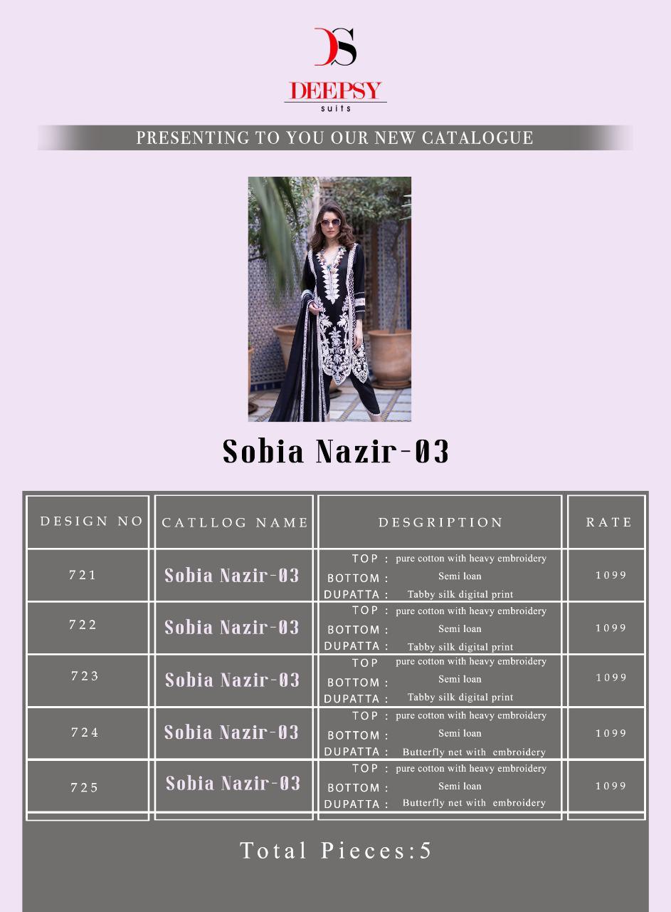 Brand - Deepsey. Catlog name - SOBIA NAZIR-03. Rate- 1099 per Pcs . Set to set. GST 5 Percent Extra. Delivery 3-4 days |