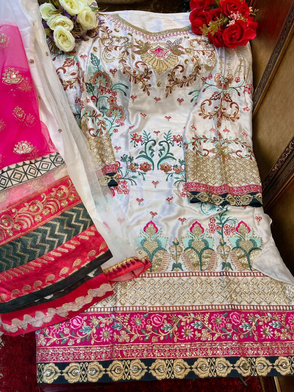 Design no.D-105 Fabric: Top: Silk satin with embroidery Bottam: Net with embroidery ( Plazzo stiched ) Dupatta : Butterfly net with embroidery *Rate:-1225/-* * Special pouch packing* *_Quilted Fabric Used For best quality results_* 100+single |