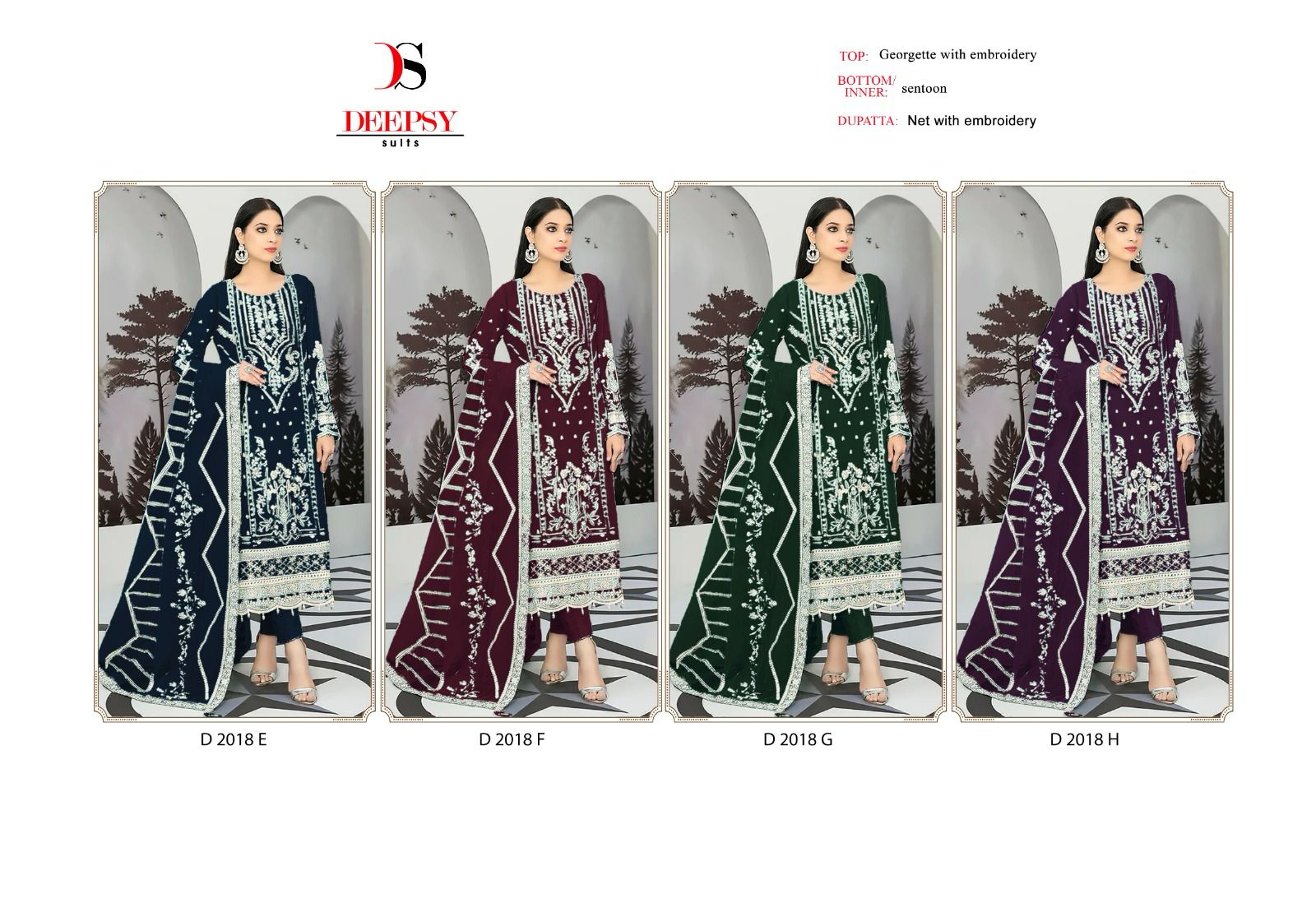 Design no.D-2018 EFGH Fabric: Top: Georgette with embroidery& Hand work (semi stich ) Bottam:- Sentoon Dupatta :Net with embroidery *Rate :1075/-* GST 5%SHIP EXTRA *Special pouch packing* *_Quilted Fabric Used For best quality results_* 100+single |