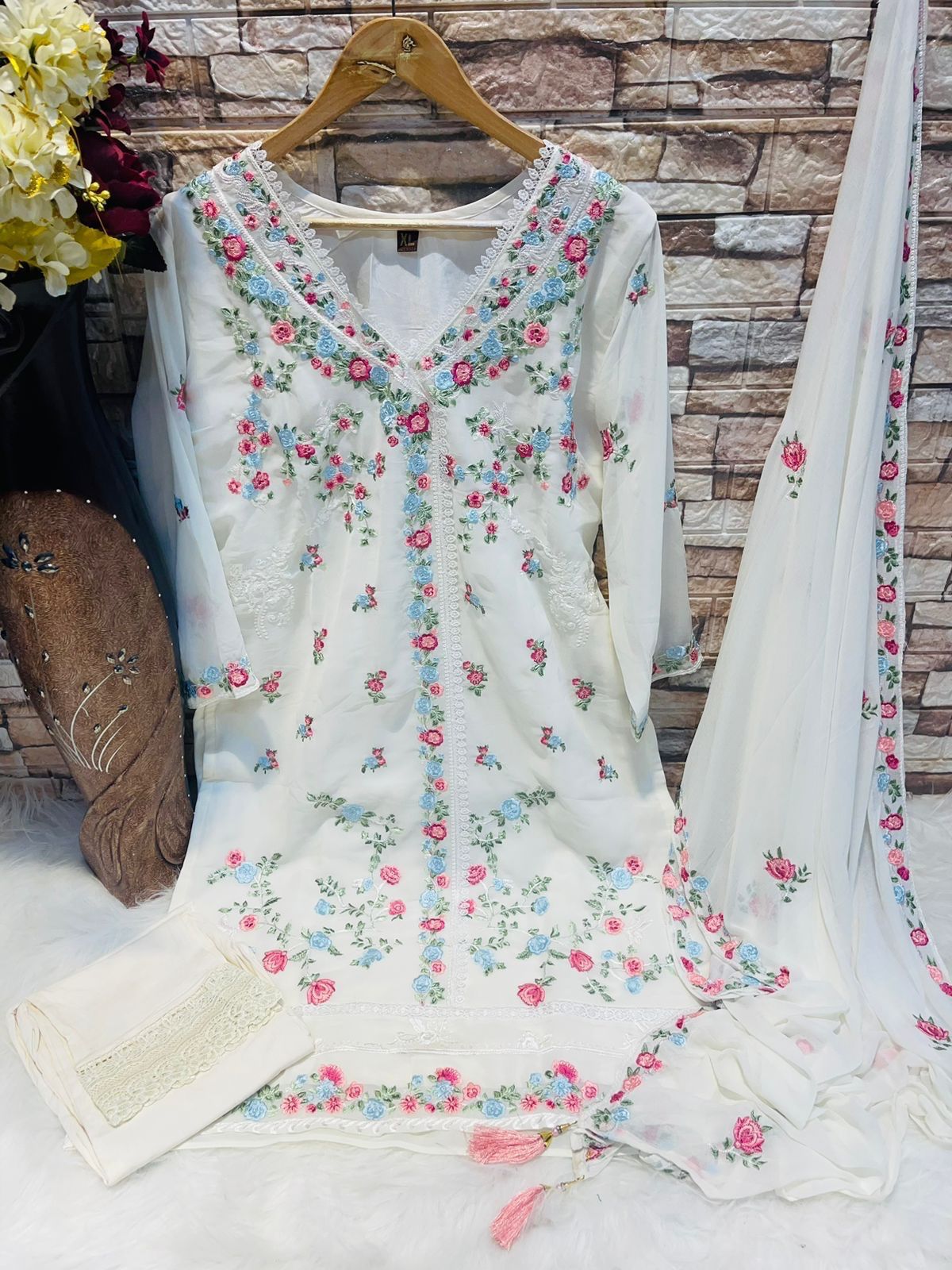 *Ready to wear collcetion by DEEPSY SUITS* *D no.: D-275* Top -Georgette with embroidery & with santoon inner Bot -Cotton Lycra stiched pant style Dup -Pure Nazmeen chiffon with embroidery attached with lace Size- Xl-XXL *Rate:-1400/-* Gst ship extra *_Quilted Fabric Used For best quality results_* 100+Singles |