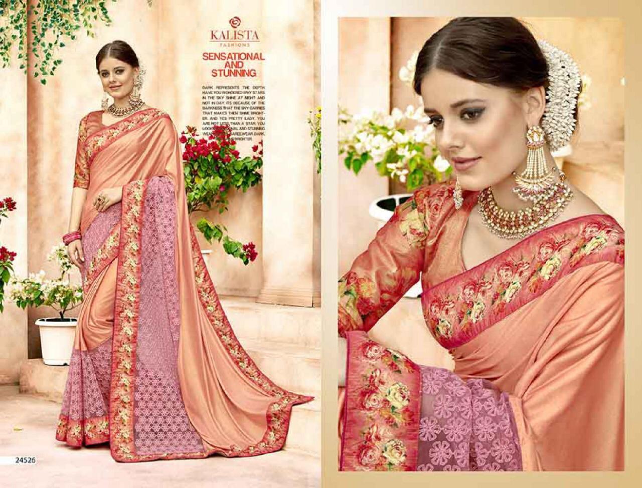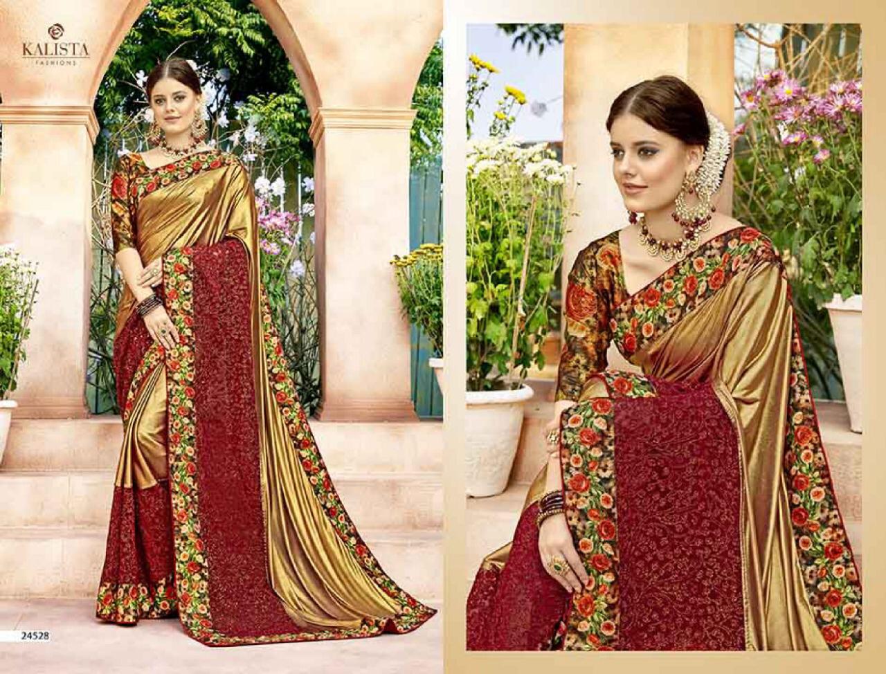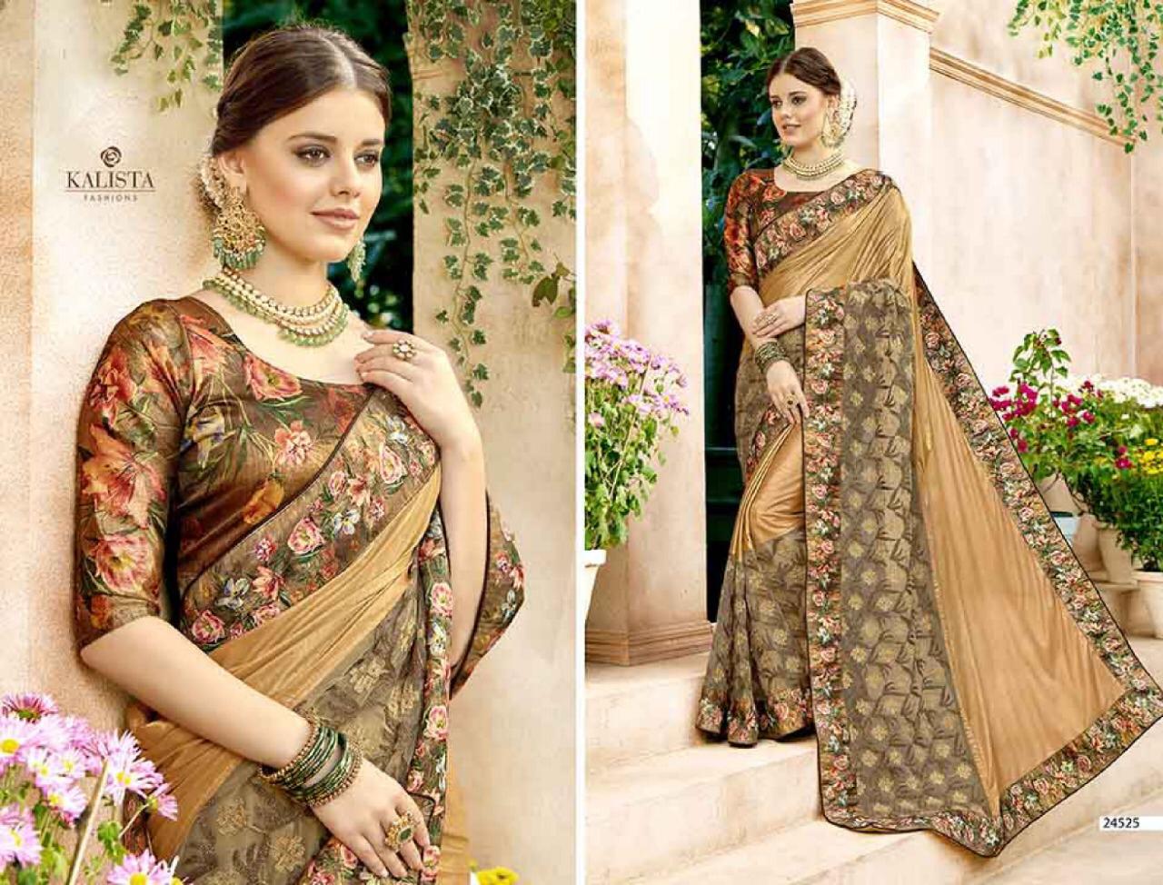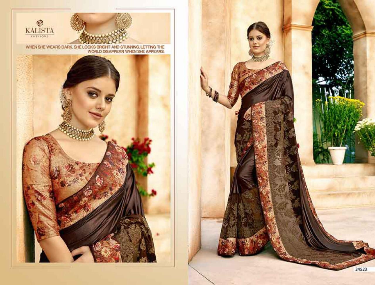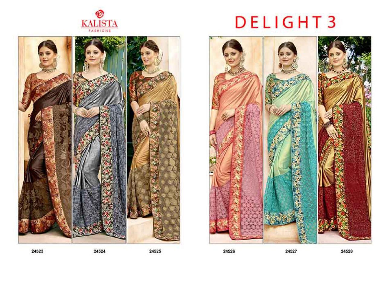 Buy Online Delight Vol 3 By Kalista 24523 Series Fancy Party Wear Saree Collection Wholesaler Surat 6 Pcs of Full Catalogue at Wholesale Price. Looking for Delight Vol 3 By Kalista 24523 Series Fancy Party Wear Saree Collection Wholesaler Surat Full Catalouge at Best Price? Buy Now Delight Vol 3 By Kalista 24523 Series Fancy Party Wear Saree Collection Wholesaler Surat at Wholesale Rate of Rs 8370 with Total 6 Pcs from authroized dealer and supplier of KALISTA FASHION Brand. Cost of Each piece is just only Rs 1395 which is very low and affordable price to resale the product in your retail store ,This is Surat based Wholesale Supplier & Dealer of KALISTA FASHION Brand. Click on Brand name to Know more about KALISTA FASHION Brand's products.Call or Whatsapp on 9898838984 for booking or enquiry