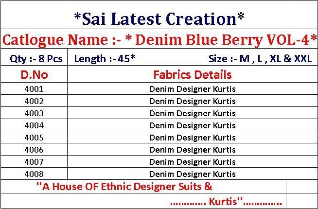 Buy Online Denim Blue Berry Vol 4 By Sai Creation Denim Kurtis Catalog Wholesale Supplier Surat 8 Pcs of Full Catalogue at Wholesale Price. Looking for Denim Blue Berry Vol 4 By Sai Creation Denim Kurtis Catalog Wholesale Supplier Surat Full Catalouge at Best Price? Buy Now Denim Blue Berry Vol 4 By Sai Creation Denim Kurtis Catalog Wholesale Supplier Surat at Wholesale Rate of Rs 4600 with Total 8 Pcs from authroized dealer and supplier of BRAND'S Brand. Cost of Each piece is just only Rs 575 which is very low and affordable price to resale the product in your retail store ,This is Surat based Wholesale Supplier & Dealer of BRAND'S Brand. Click on Brand name to Know more about BRAND'S Brand's products.Call or Whatsapp on 9898838984 for booking or enquiry