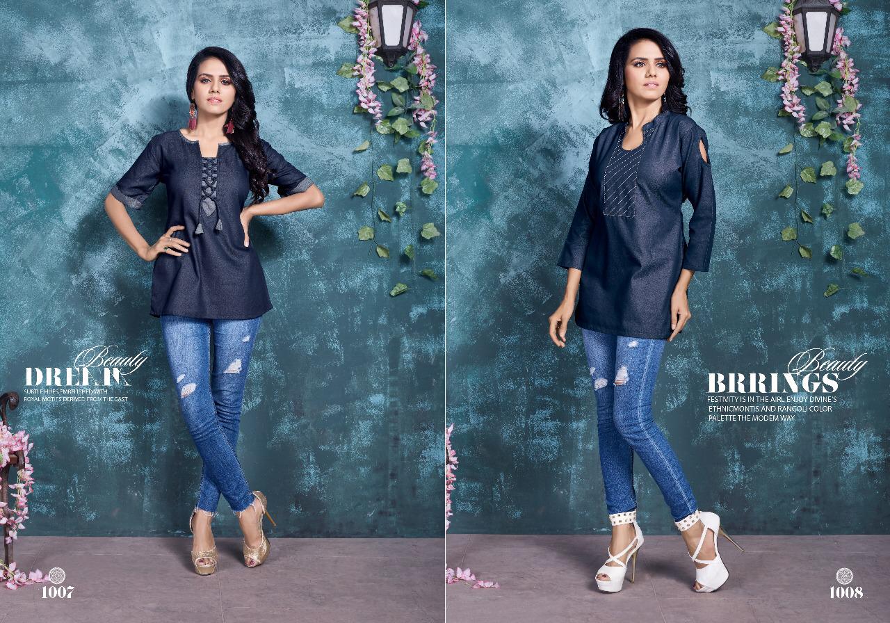 Buy Online Denim By Watermelon 1001 Series Fancy Denim Western Top Collection Wholesaler Surat 8 Pcs of Full Catalogue at Wholesale Price. Looking for Denim By Watermelon 1001 Series Fancy Denim Western Top Collection Wholesaler Surat Full Catalouge at Best Price? Buy Now Denim By Watermelon 1001 Series Fancy Denim Western Top Collection Wholesaler Surat at Wholesale Rate of Rs 2840 with Total 8 Pcs from authroized dealer and supplier of WATERMELON Brand. Cost of Each piece is just only Rs 355 which is very low and affordable price to resale the product in your retail store ,This is Surat based Wholesale Supplier & Dealer of WATERMELON Brand. Click on Brand name to Know more about WATERMELON Brand's products.Call or Whatsapp on 9898838984 for booking or enquiry