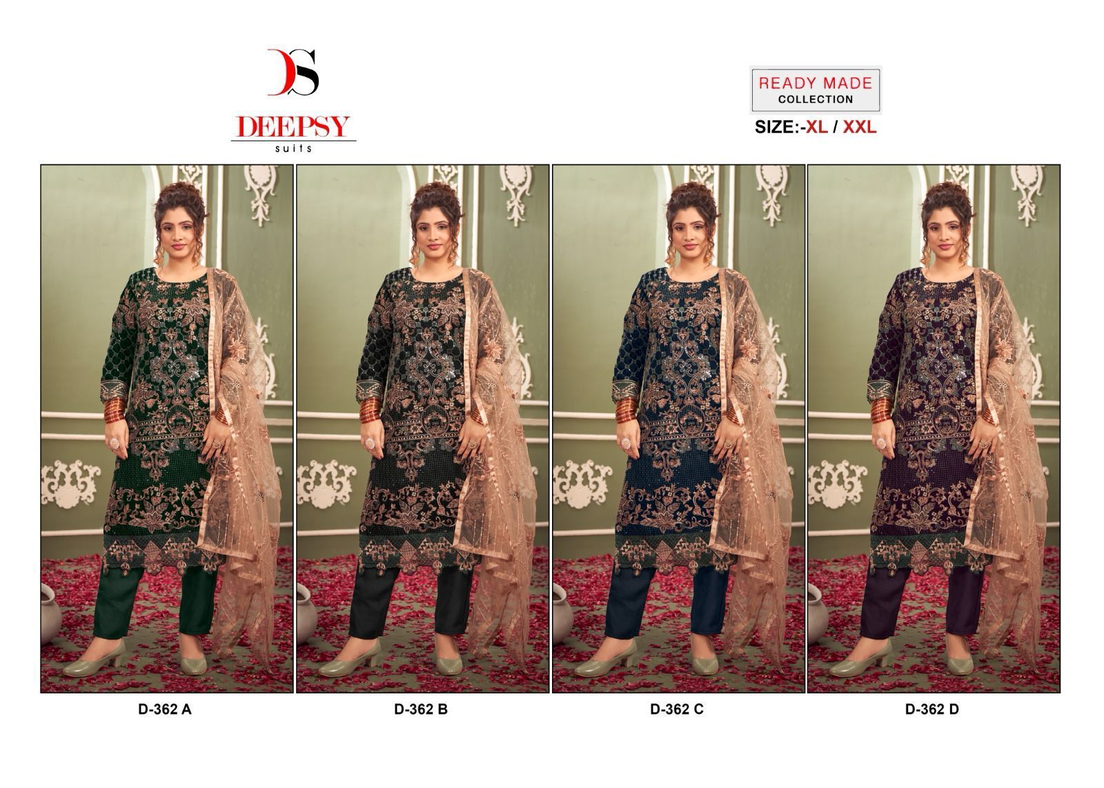 Buy Online Design 362 Abcd By Deepsy Readymade Collection Manufacturer Surat 4 Pcs of Full Catalogue at Wholesale Price. Looking for Design 362 Abcd By Deepsy Readymade Collection Manufacturer Surat Full Catalouge at Best Price? Buy Now Design 362 Abcd By Deepsy Readymade Collection Manufacturer Surat at Wholesale Rate of Rs 6000 with Total 4 Pcs from authroized dealer and supplier of DEEPSY Brand. Cost of Each piece is just only Rs 1500 which is very low and affordable price to resale the product in your retail store ,This is Surat based Wholesale Supplier & Dealer of DEEPSY Brand. Click on Brand name to Know more about DEEPSY Brand's products.Call or Whatsapp on 9898838984 for booking or enquiry